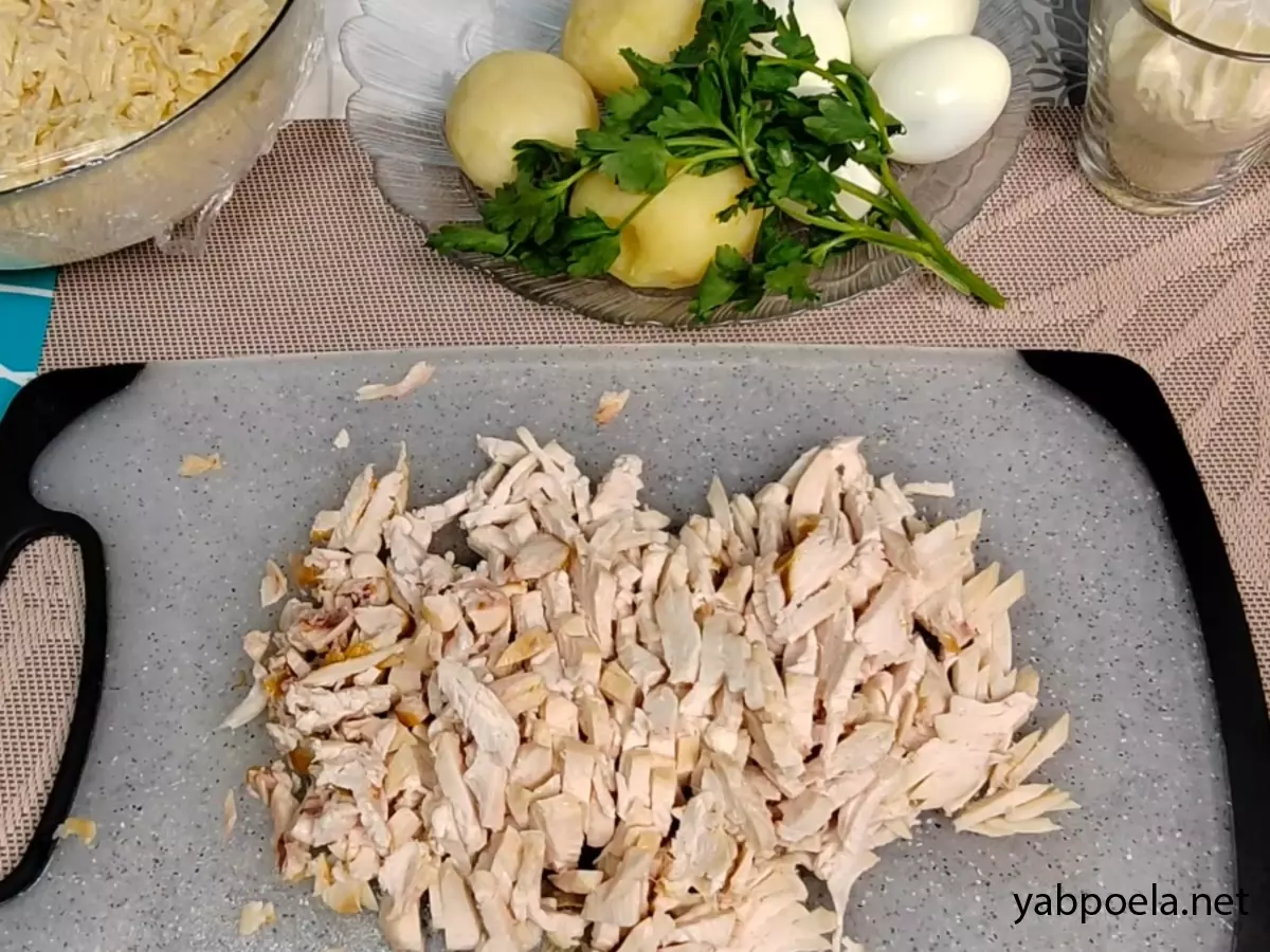 2-й слой (Мясной): Выложите нарезанную копченую курицу. Разровняйте. Смажьте майонезом.