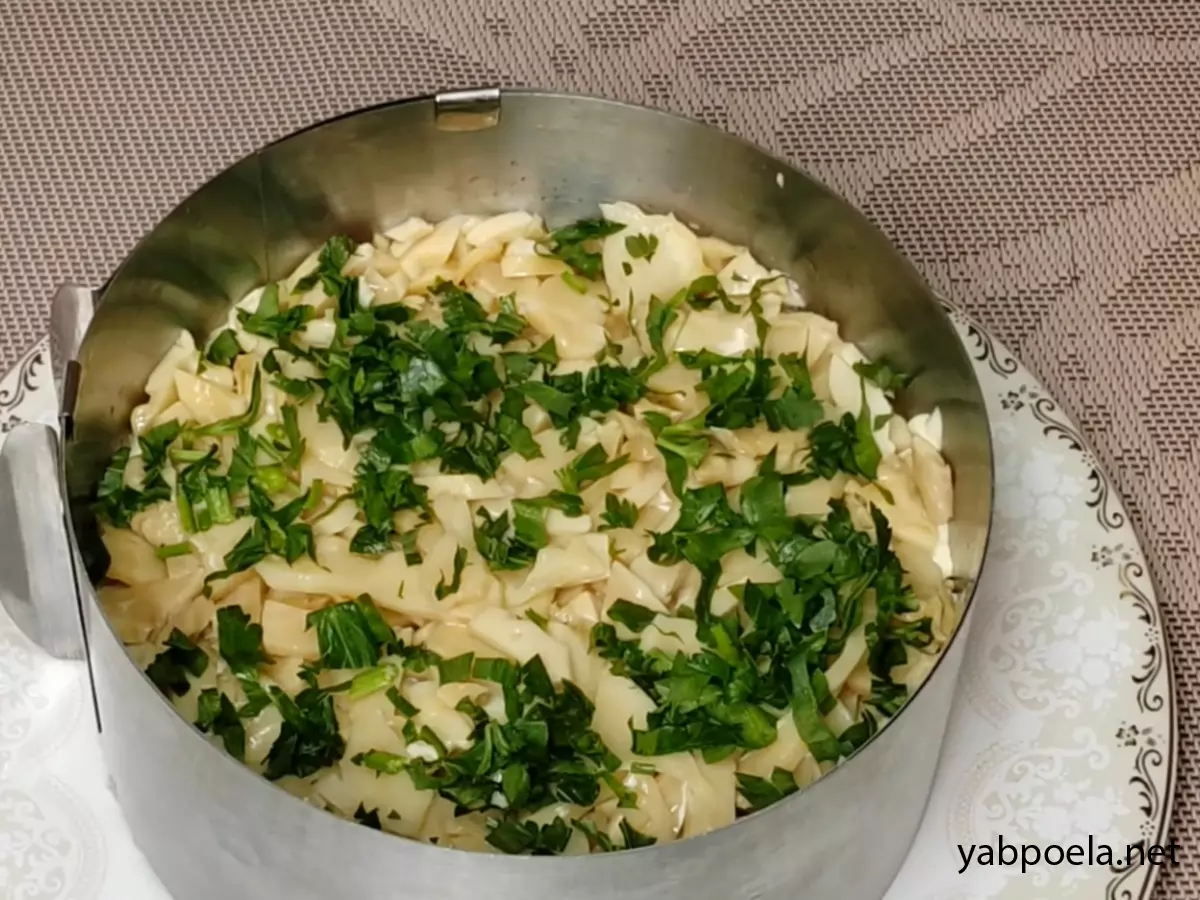 3-й слой (Грибной): Выложите грибы. Сверху посыпьте рубленой зеленью (петрушкой).