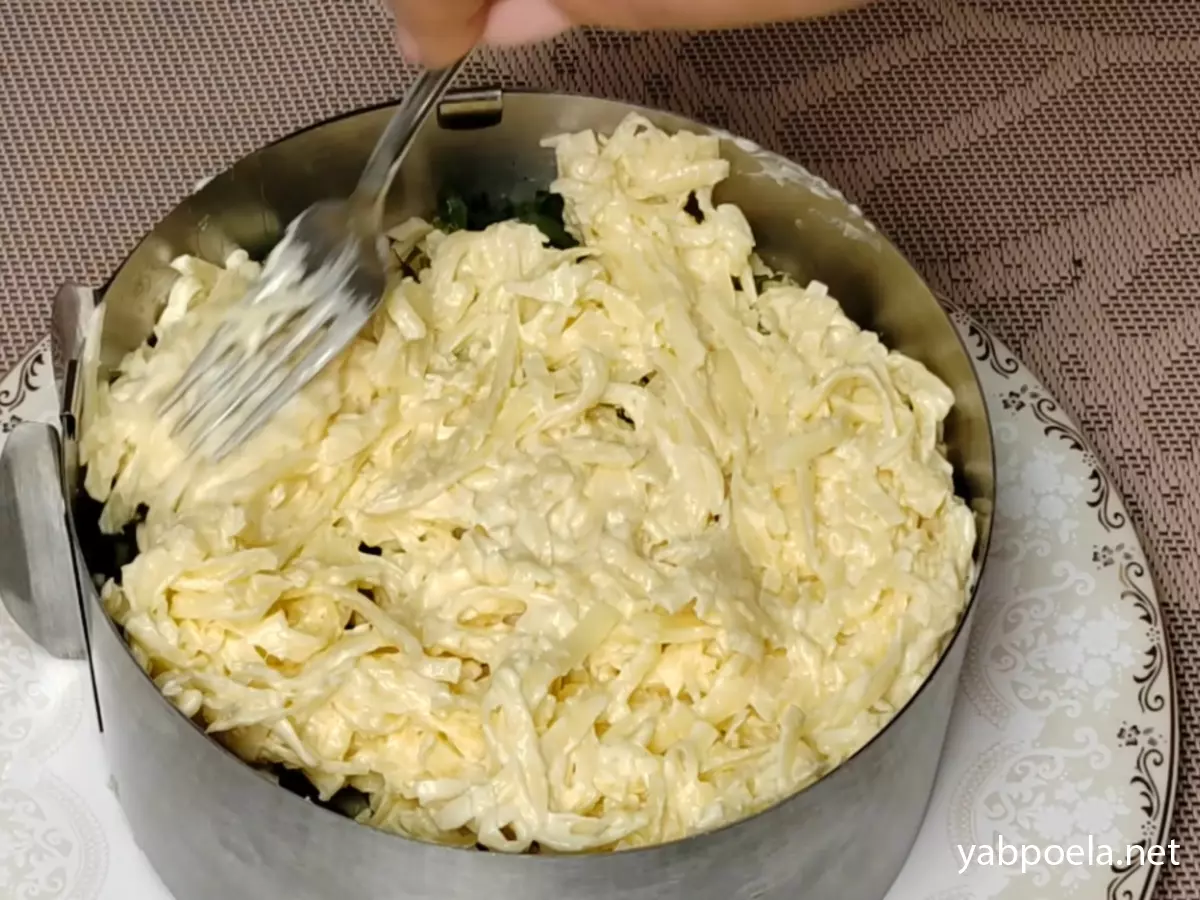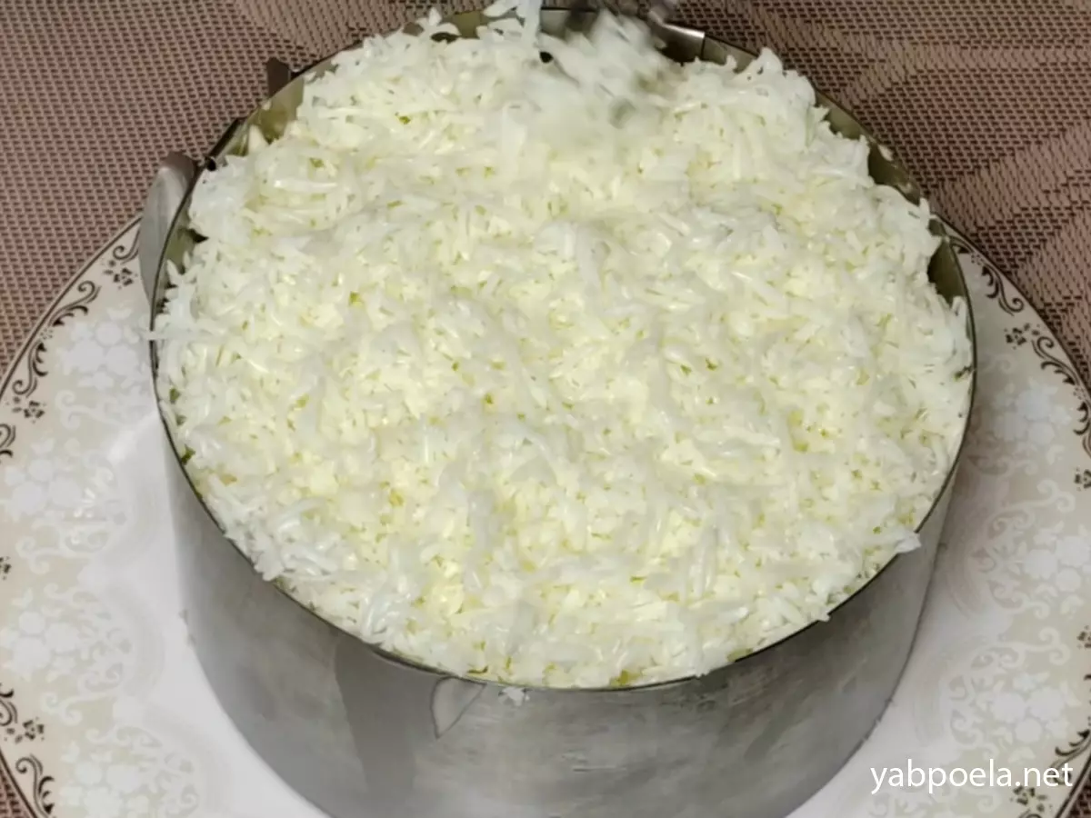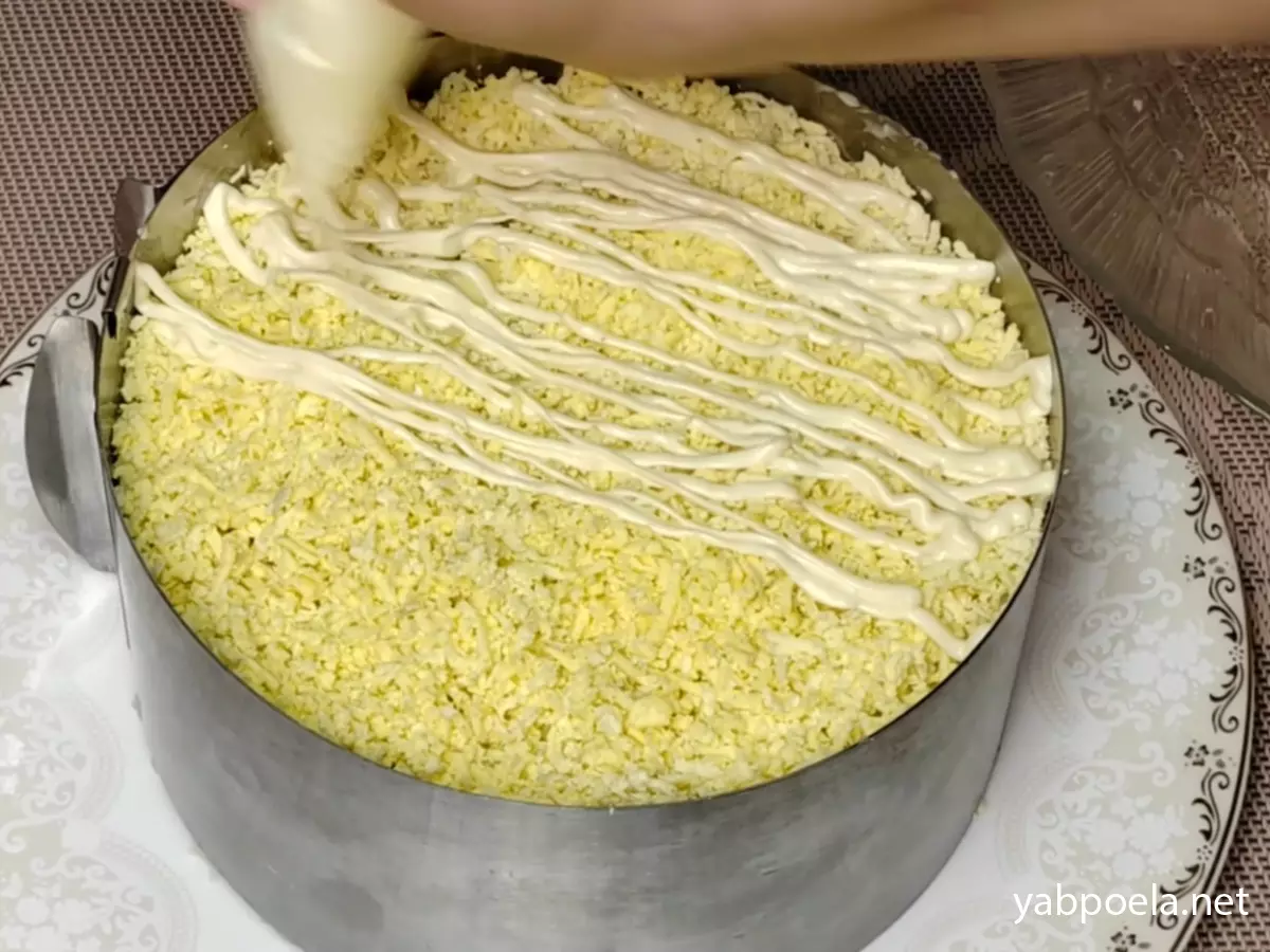 5-й слой (Желтковый): Натрите желтки на мелкой терке. Распределите их пушистым слоем, не придавливая. Сверху нанесите майонез.