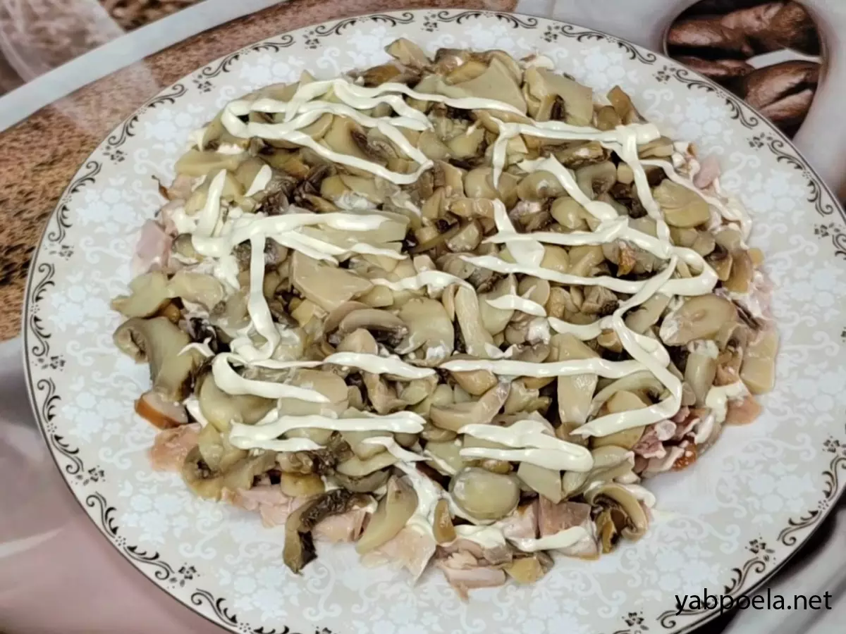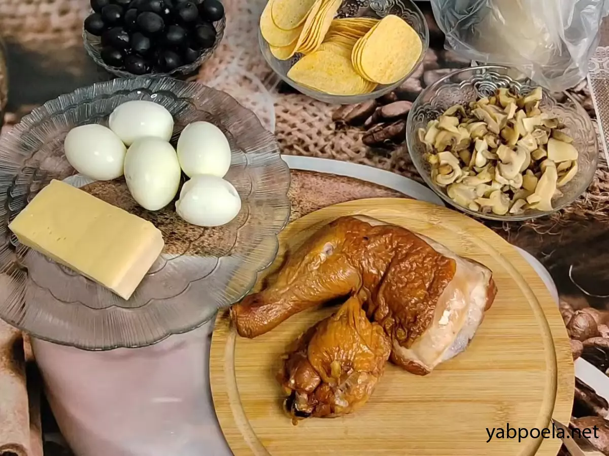 - Грибы: С копченой курицей идеально сочетаются именно маринованные (консервированные) грибы. Если используете отварное мясо, грибы лучше обжарить с луком для вкуса.