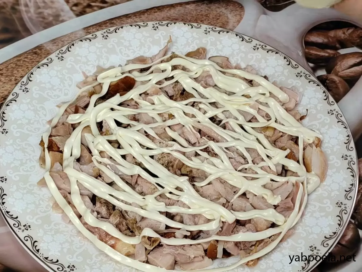 1-й слой (Мясной): Выложите нарезанную курицу ровным слоем, придавая салату круглую форму. Слегка поперчите (солить копченую курицу обычно не нужно). Смажьте майонезом.