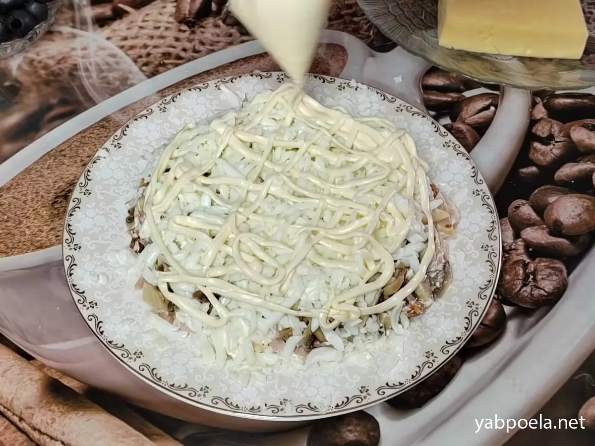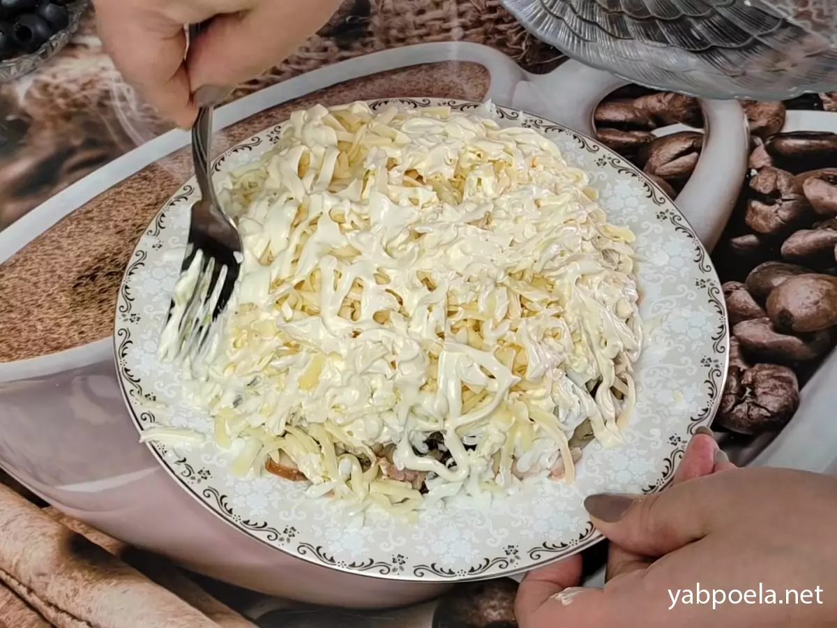 4-й слой (Сырный): Натрите сыр на крупной терке. Этот слой нужно хорошо промазать майонезом и выровнять поверхность ложкой, придавая салату аккуратную форму полусферы.