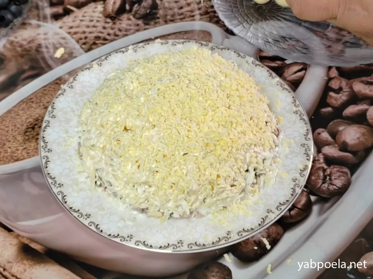 5-й слой (Финальный): Натрите 3 желтка на мелкой терке, полностью покрывая верх и бока салата, чтобы он стал желтым и пушистым.