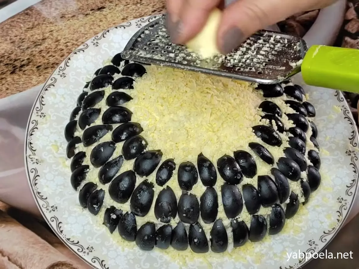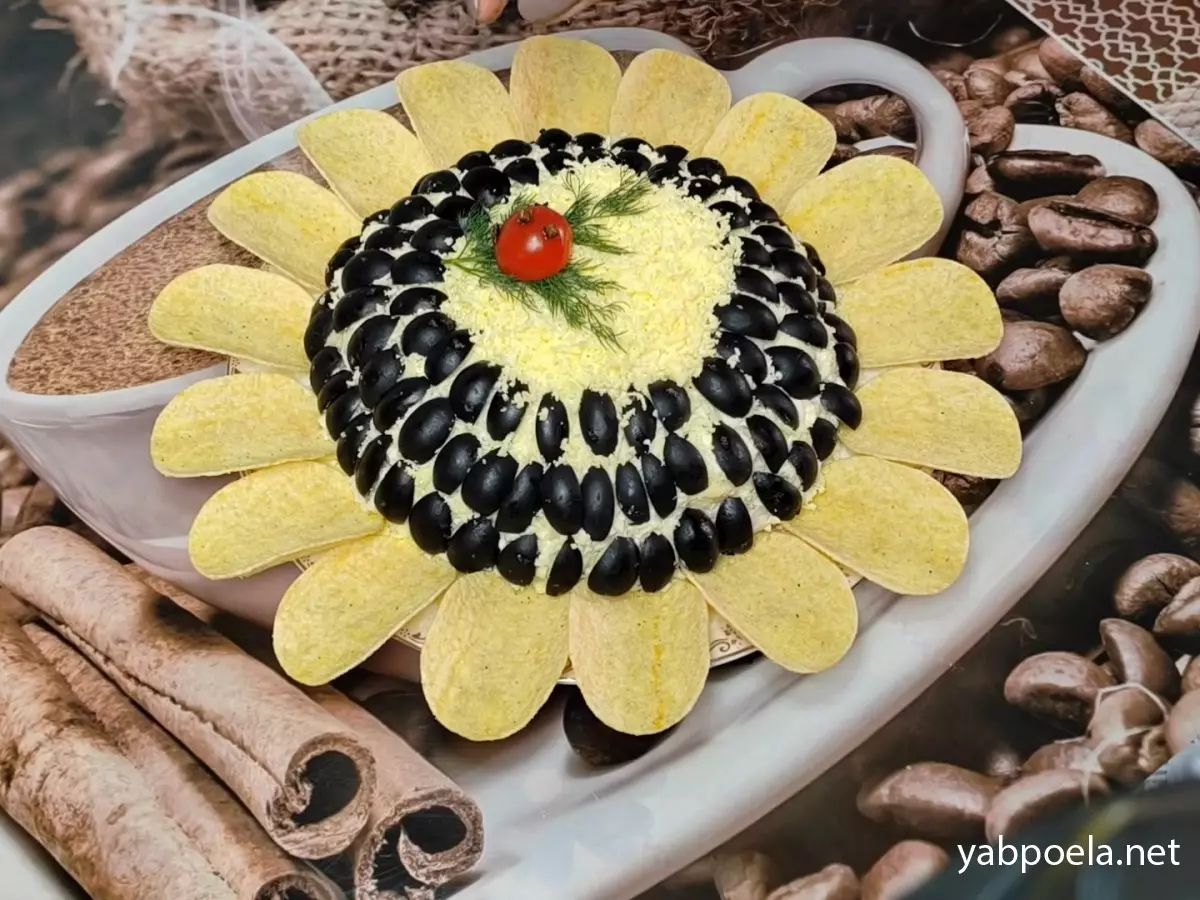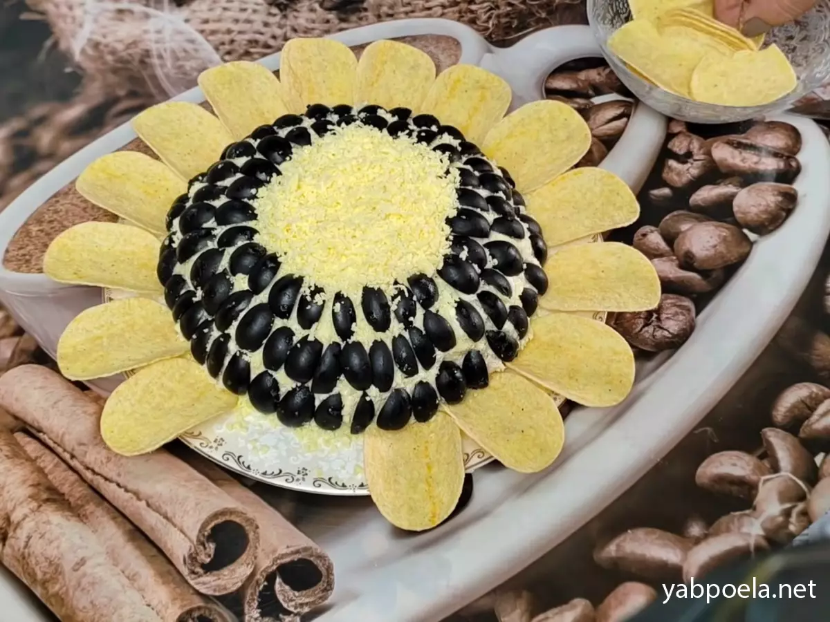 Украшение "Семечки": Поверх желткового слоя аккуратно выложите нарезанные маслины по кругу, имитируя семечки подсолнуха. В самый центр можно натереть оставшийся 1 желток для объема.
