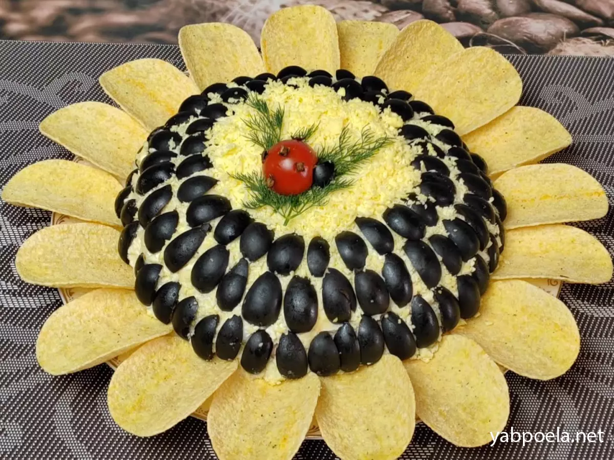 Этот салат — настоящий хит праздничных застолий. Благодаря оформлению в виде цветка подсолнуха он становится главным украшением стола. Сочетание подкопченного мяса, грибов и сыра дает богатый вкус, а чипсы добавляют приятный хруст. Готовится очень просто, а выглядит как ресторанное блюдо!