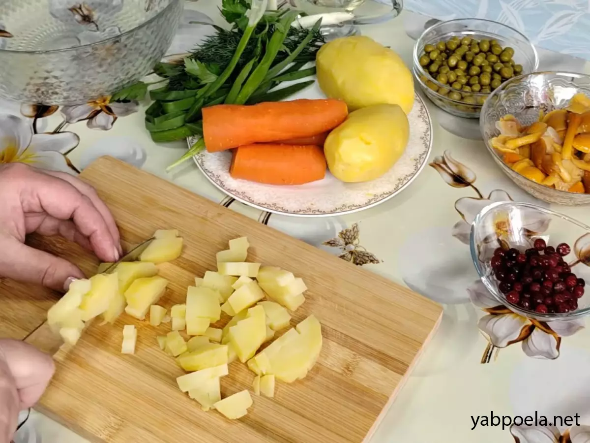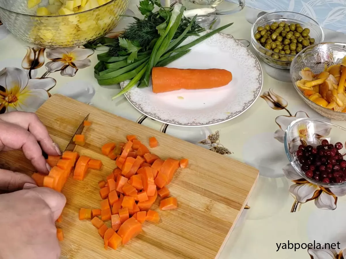 Заранее отварите картофель и морковь (в мундире) или запеките их в духовке. Очистите. Нарежьте картофель средним кубиком (кто-то любит крупнее, кто-то мельче — на ваш вкус). Отправьте нарезанный картофель в салатник.