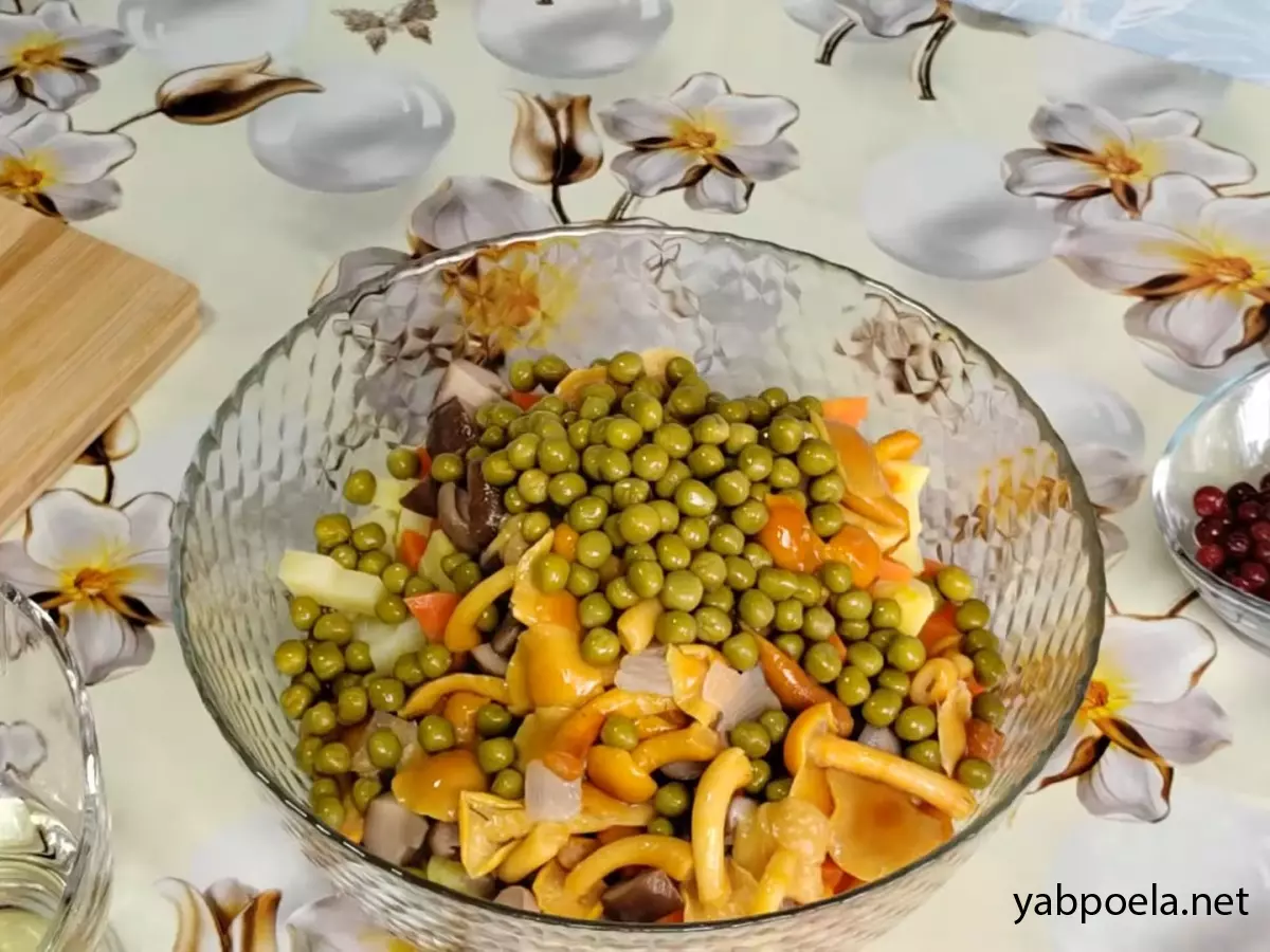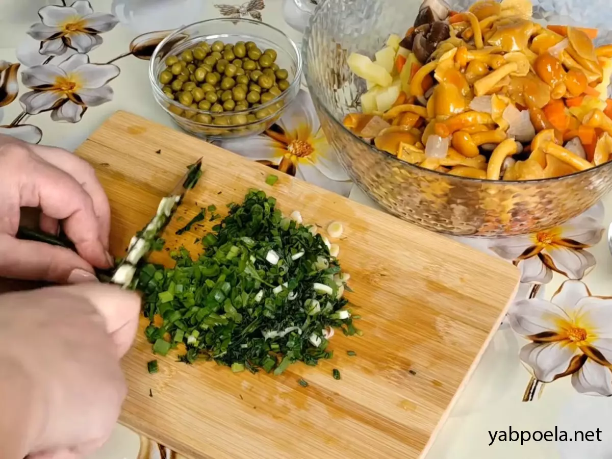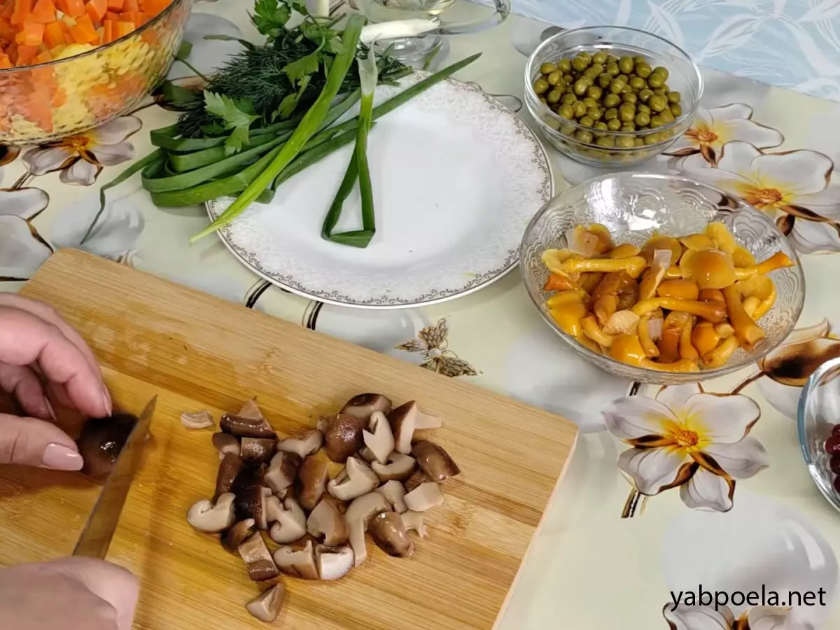Возьмите маринованные грибы (200 г). Если у вас мелкие опята — добавляйте целиком. Если грибы крупные — немного их измельчите ножом. Отправьте грибы в общий салатник.
