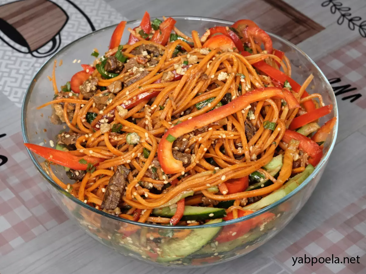 Этот салат в азиатском стиле — один из моих самых любимых! Он получается невероятно ярким, хрустящим и очень вкусным. Благодаря сочетанию сочной обжаренной говядины и свежих овощей, блюдо выходит одновременно сытным и легким. Секрет его «бомбического» вкуса кроется в пикантной заправке с соевым соусом и аромате обжаренного кунжута. Такой салат обязательно впечатлит ваших гостей, и будьте готовы к тому, что они точно попросят рецепт!