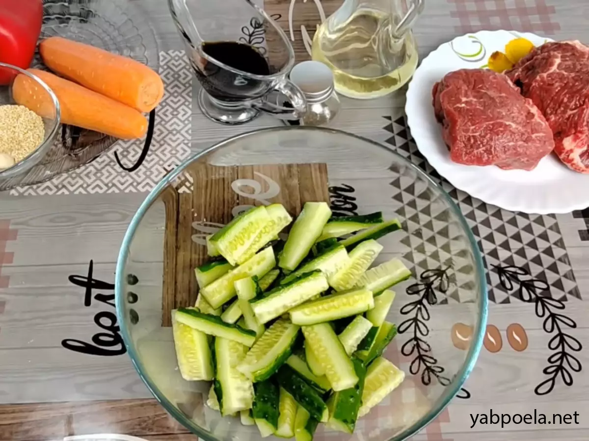 Начните с огурцов. Нарежьте их брусочками (сначала на три части, затем вдоль). Отправьте в емкость, добавьте пол чайной ложки соли, перемешайте и оставьте, чтобы они пустили сок.