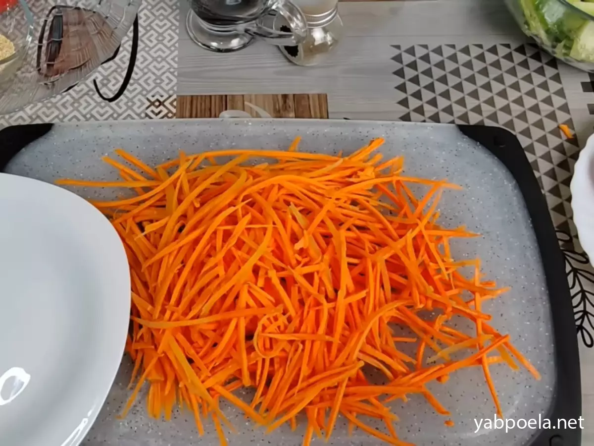 Возьмите морковь (2 шт.) и натрите её длинной тонкой соломкой на специальной терке или нарежьте вручную. Пока отложите в сторону.