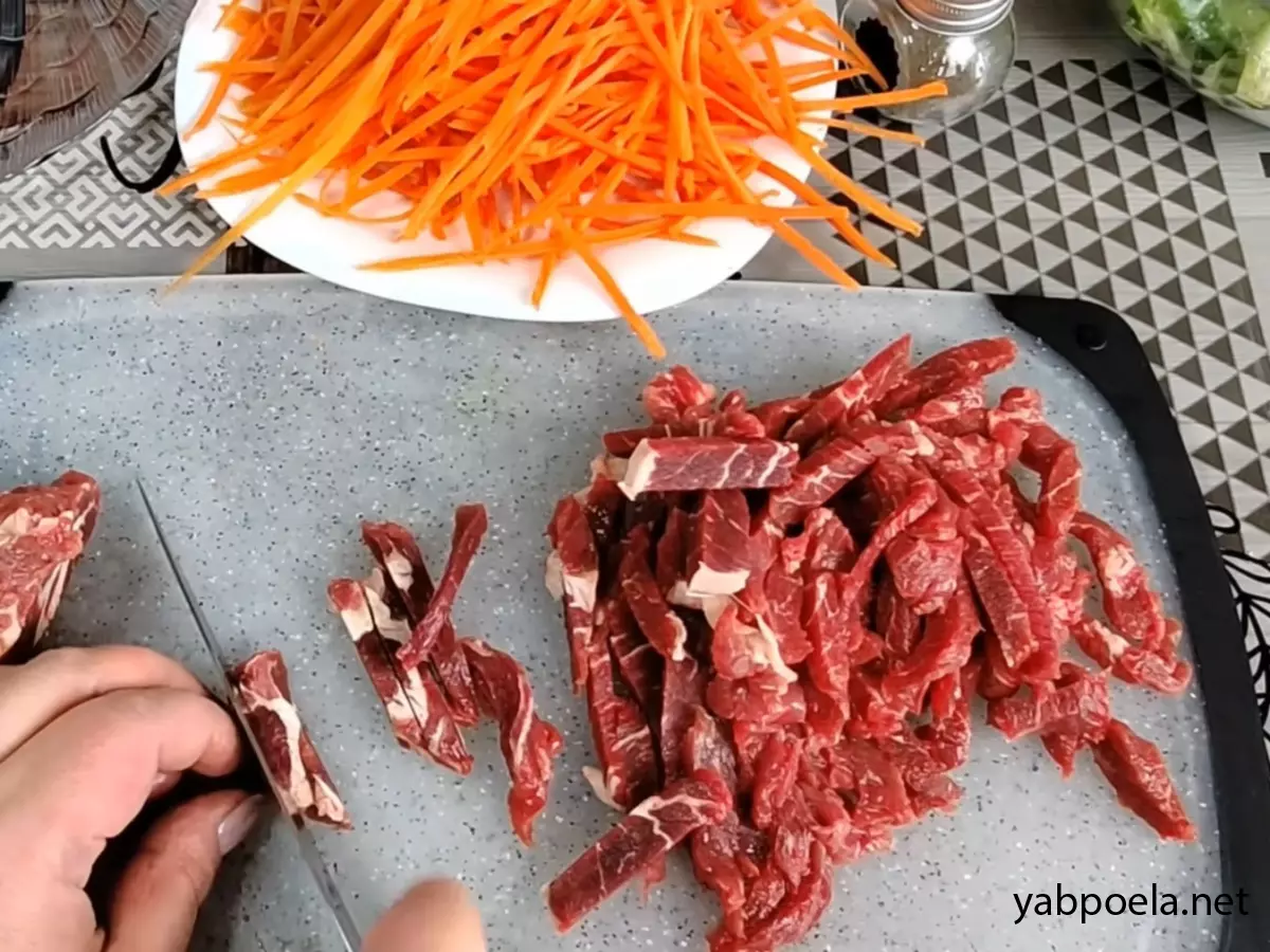 Подготовьте мясо. Говядину (500 г) нарежьте тонкими полосками, желательно поперек волокон — так она быстрее приготовится и будет мягче.