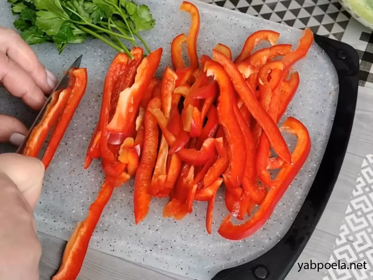 Пока жарится мясо, нарежьте болгарский перец тонкой соломкой.