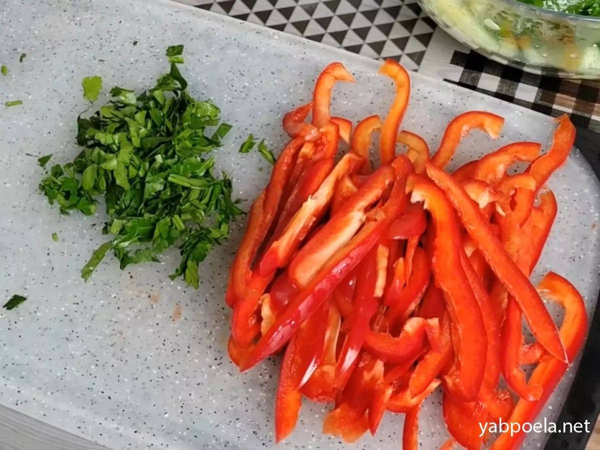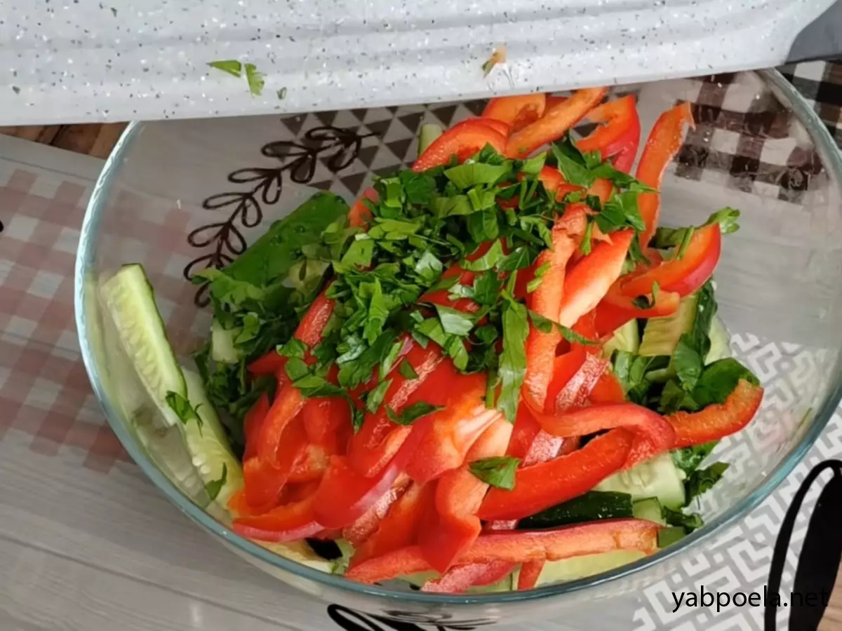 Вернитесь к огурцам: слейте весь образовавшийся сок, он нам не понадобится. К огурцам добавьте нарезанный перец и зелень.