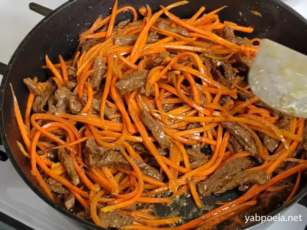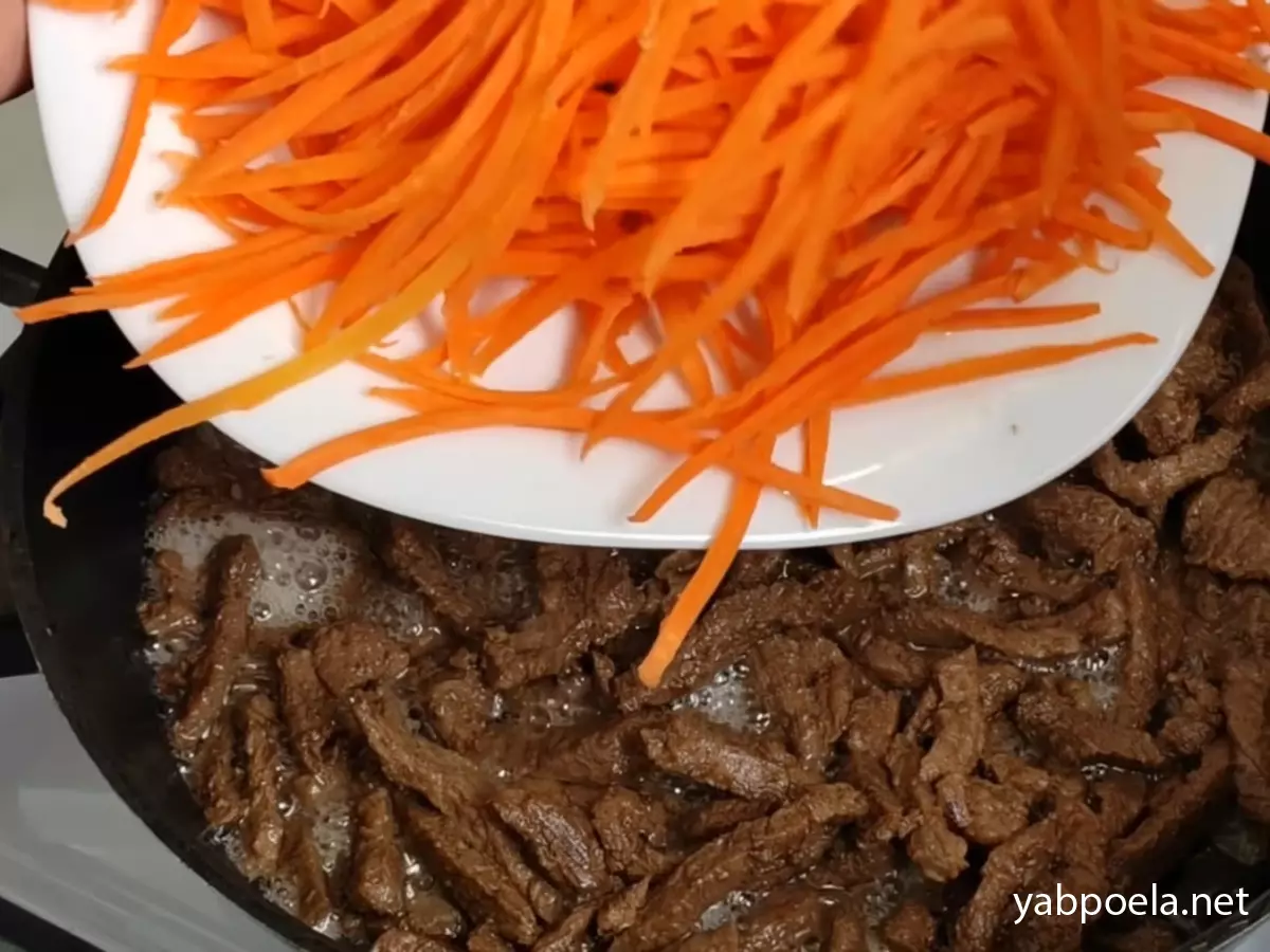 Когда мясо поджарится, отправьте к нему в сковороду морковь. Перемешайте и прогрейте всё вместе 3–4 минуты, чтобы морковь стала мягкой (жарить до хруста не нужно).