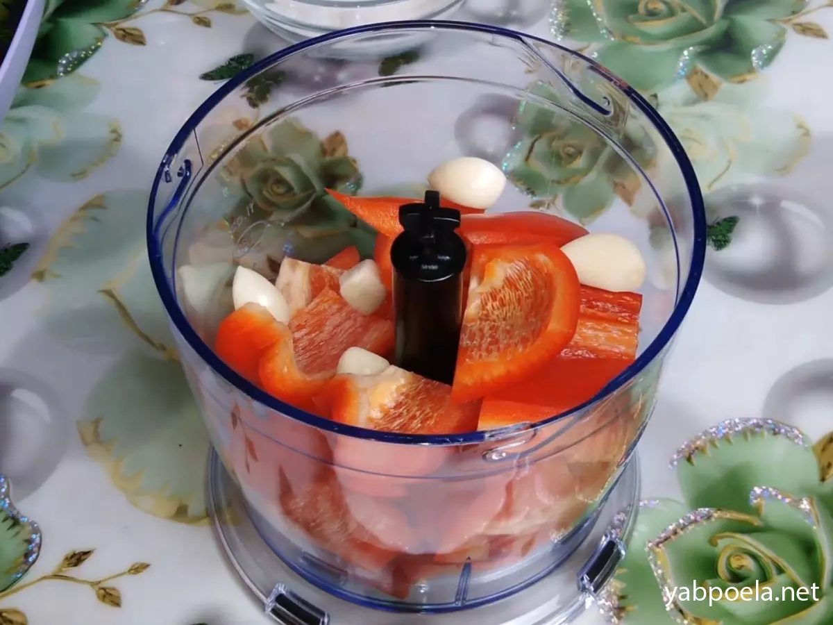 Болгарский и острый перцы очистите и нарежьте произвольно. Отправьте их в чашу блендера вместе с 5 зубчиками чеснока и семенами кориандра (около 15–20 шт.).