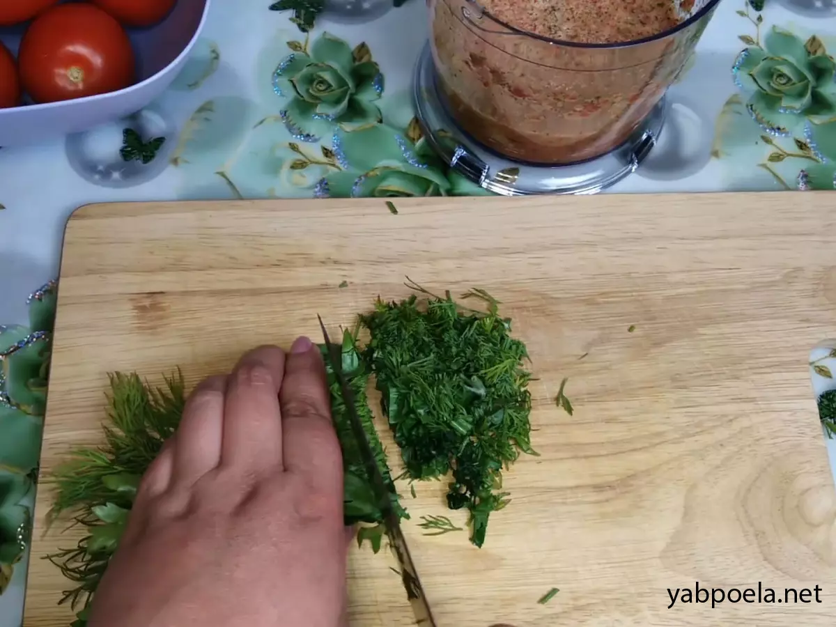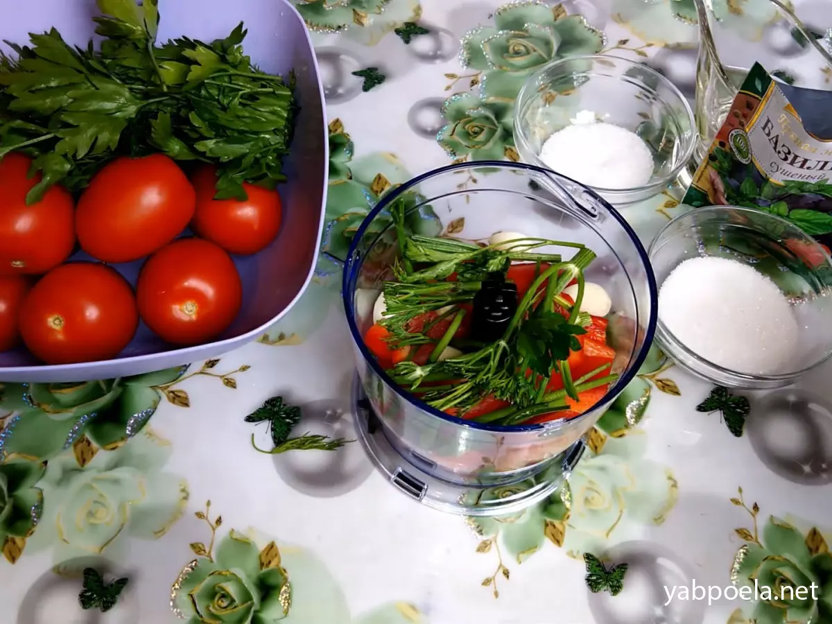 Возьмите пучки укропа и петрушки. Отрежьте от них жесткие веточки (стебли) и отправьте их в блендер к перцам. Туда же добавьте сушеный базилик (1 ч. л.), соль (1 ст. л. без горки), сахар (2 ст. л.) и растительное масло (5–6 ст. л.). Перекрутите всё до состояния мелких кусочков (не до однородного пюре).