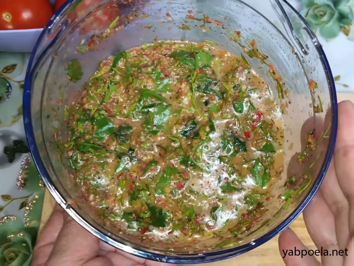 В готовую смесь из блендера добавьте 1 ст. л. уксуса 9% (или лимонный сок) и нарезанную зелень. Тщательно перемешайте заправку и отставьте в сторону.