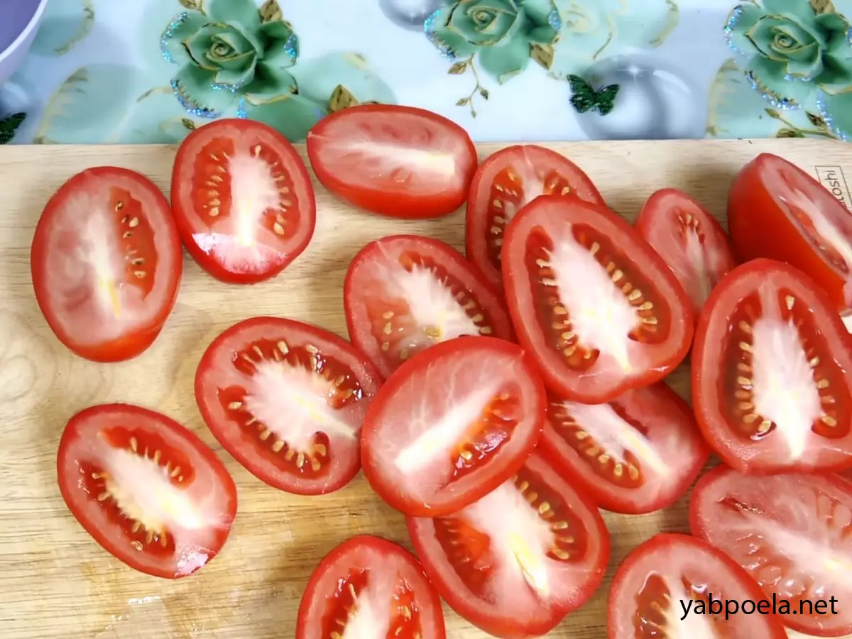 Подготовьте помидоры (1 кг). Плотные некрупные плоды разрежьте пополам и удалите плодоножки. Если помидоры крупнее, разрежьте их на 4 части.