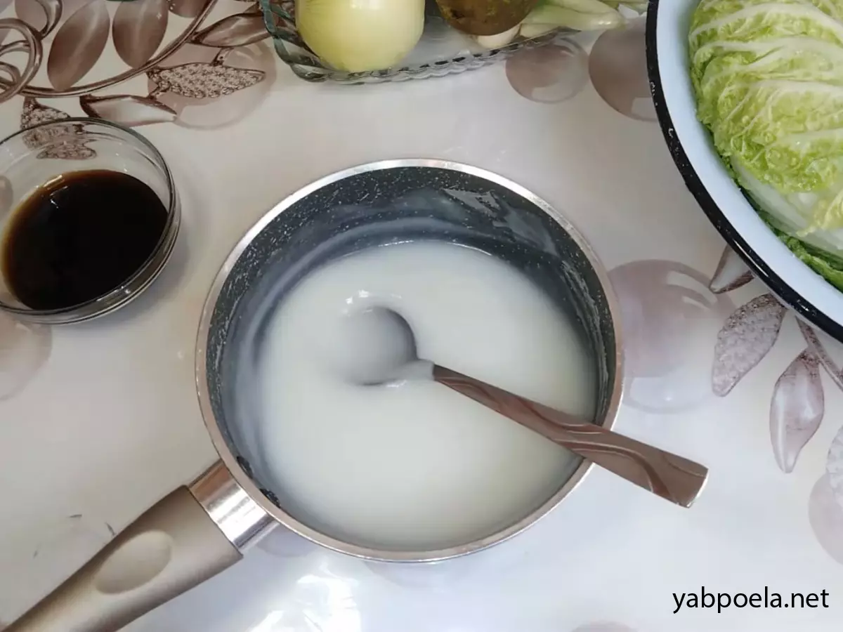 Приготовьте клейстер: смешайте 2 ст. л. рисовой муки и 250 мл воды. Поставьте на средний огонь и постоянно помешивайте до загустения. Как только начнет закипать и станет густым — снимайте с плиты и дайте полностью остыть. Сахар добавлять не нужно (его заменит груша).