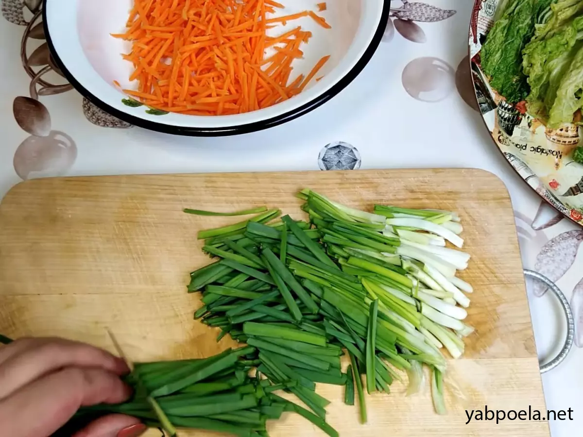 Подготовьте овощи для заправки: морковь натрите на «корейской» терке недлинной соломкой. Зеленый лук нарежьте крупно, разрезая белые части напополам. Соедините измельченную смесь из блендера, морковь, лук и остывший рисовый клейстер.