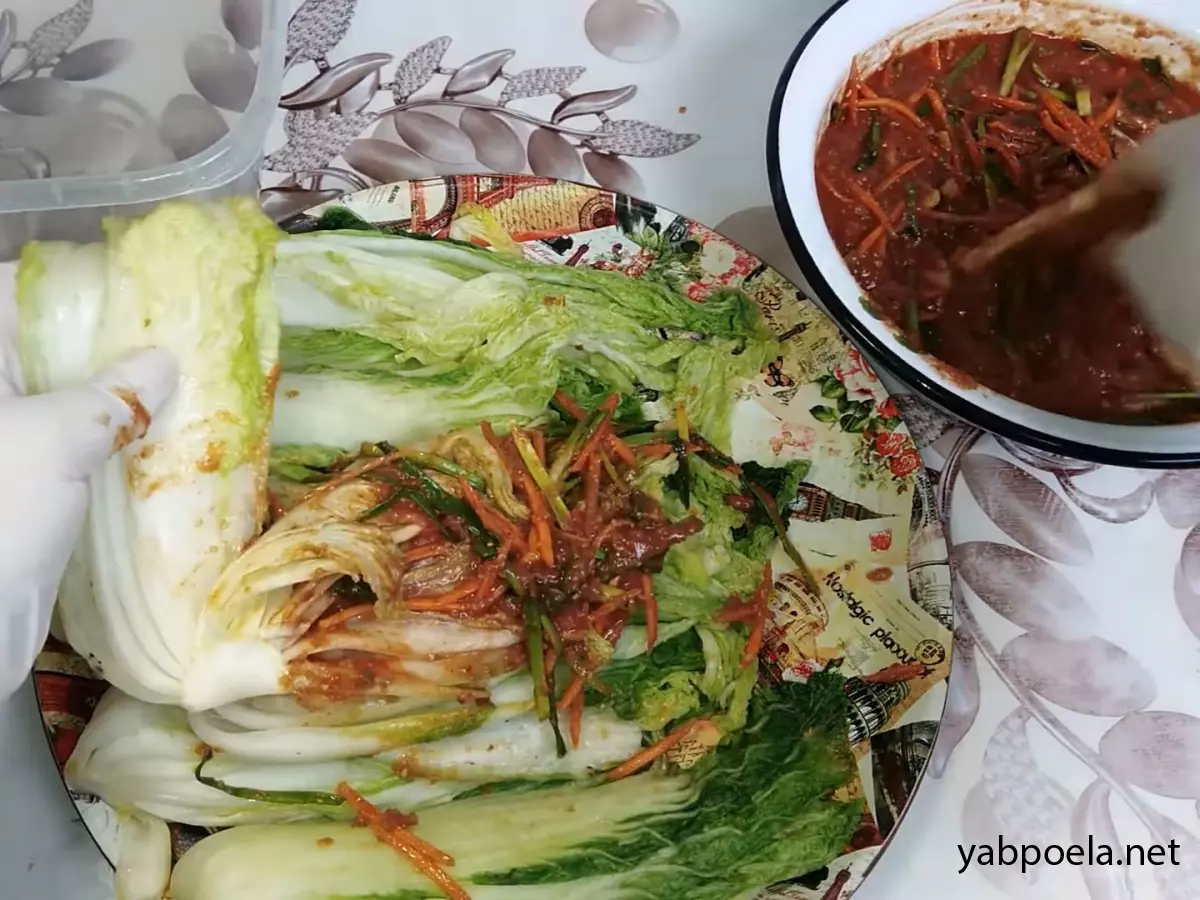 Наденьте перчатки! Промажьте каждый листик капусты (начиная с нижних) ароматной пастой. Плотненько уложите капусту в контейнер. Можно скрутить кочаны, заправив белую часть внутрь зеленой.