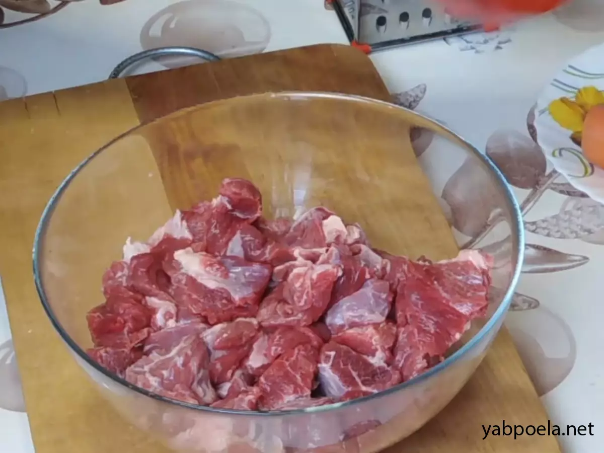 Нарежьте мясо (говядину) небольшими кусочками, примерно 2х2 см. Переложите в миску.