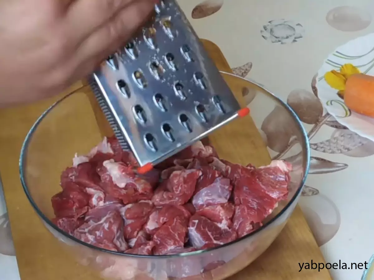 Подготовьте маринад для мяса: натрите 2 помидора на терке прямо в миску с мясом. Кожица останется в руках — её мы выбрасываем, используем только мякоть.