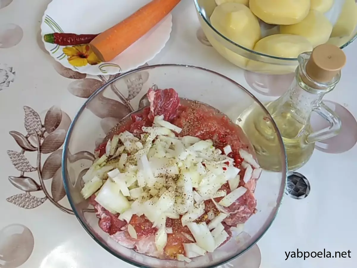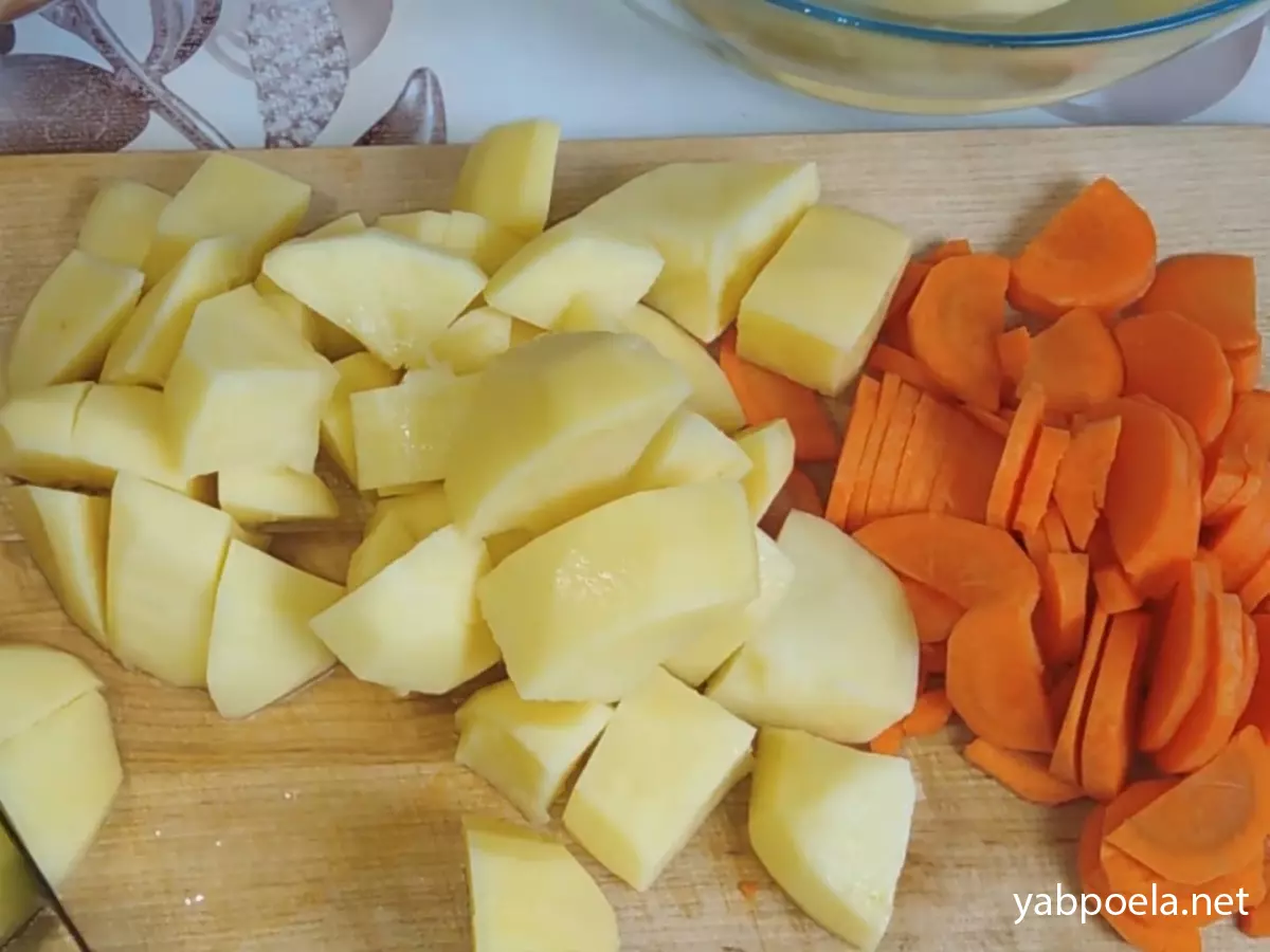 Пока мясо маринуется, подготовьте овощи. Морковь нарежьте полукольцами. Картофель нарежьте кусочками такого же размера, как и мясо.