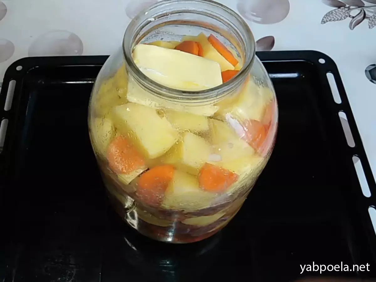 Возьмите чистую трехлитровую банку. Обязательно проверьте её на отсутствие сколов и трещин! Выкладывайте ингредиенты слоями или перемешайте всё вместе. В процессе добавьте лавровый лист (можно разломить пополам для разных слоев), слегка присолите и добавьте черный перец по вкусу.