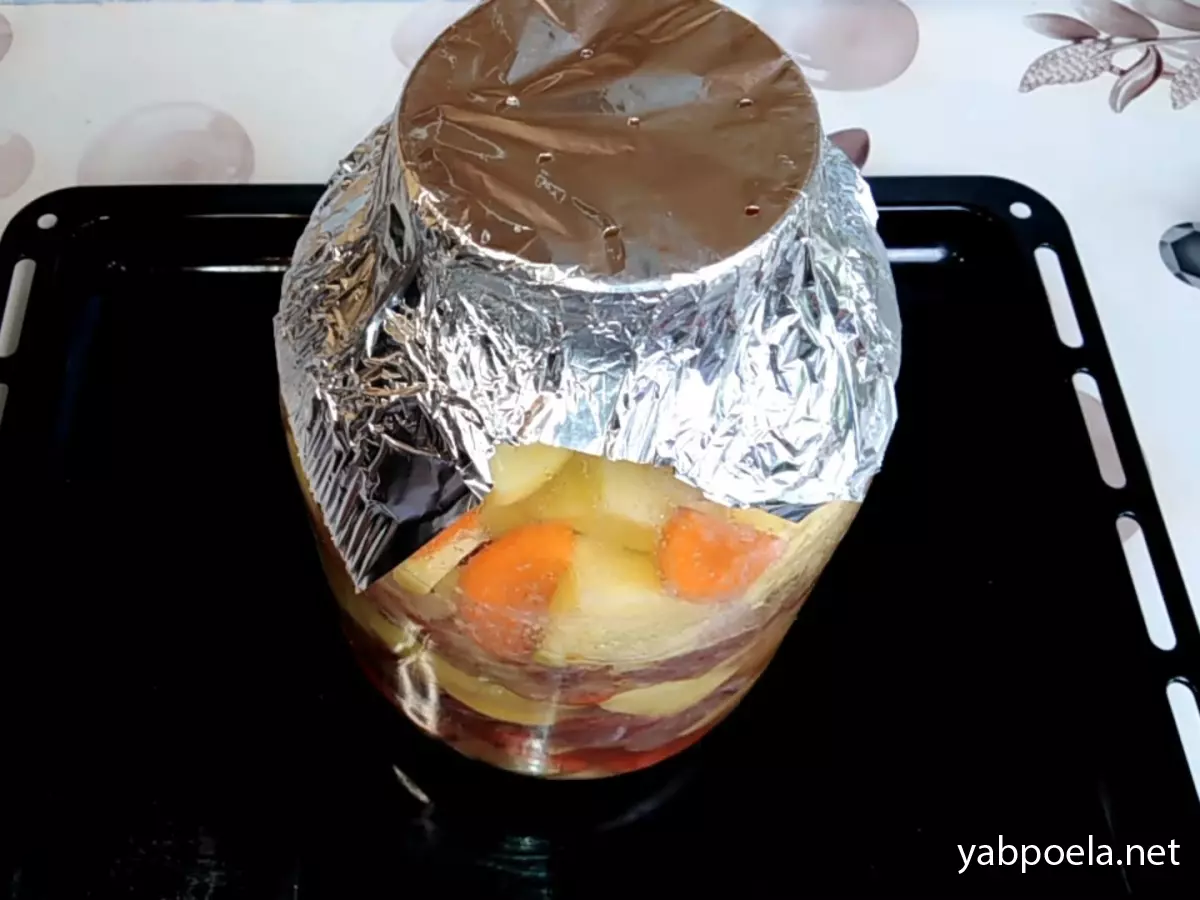 Накройте горлышко банки фольгой и плотно прижмите края. Сделайте в фольге несколько проколов зубочисткой для выхода лишнего пара.