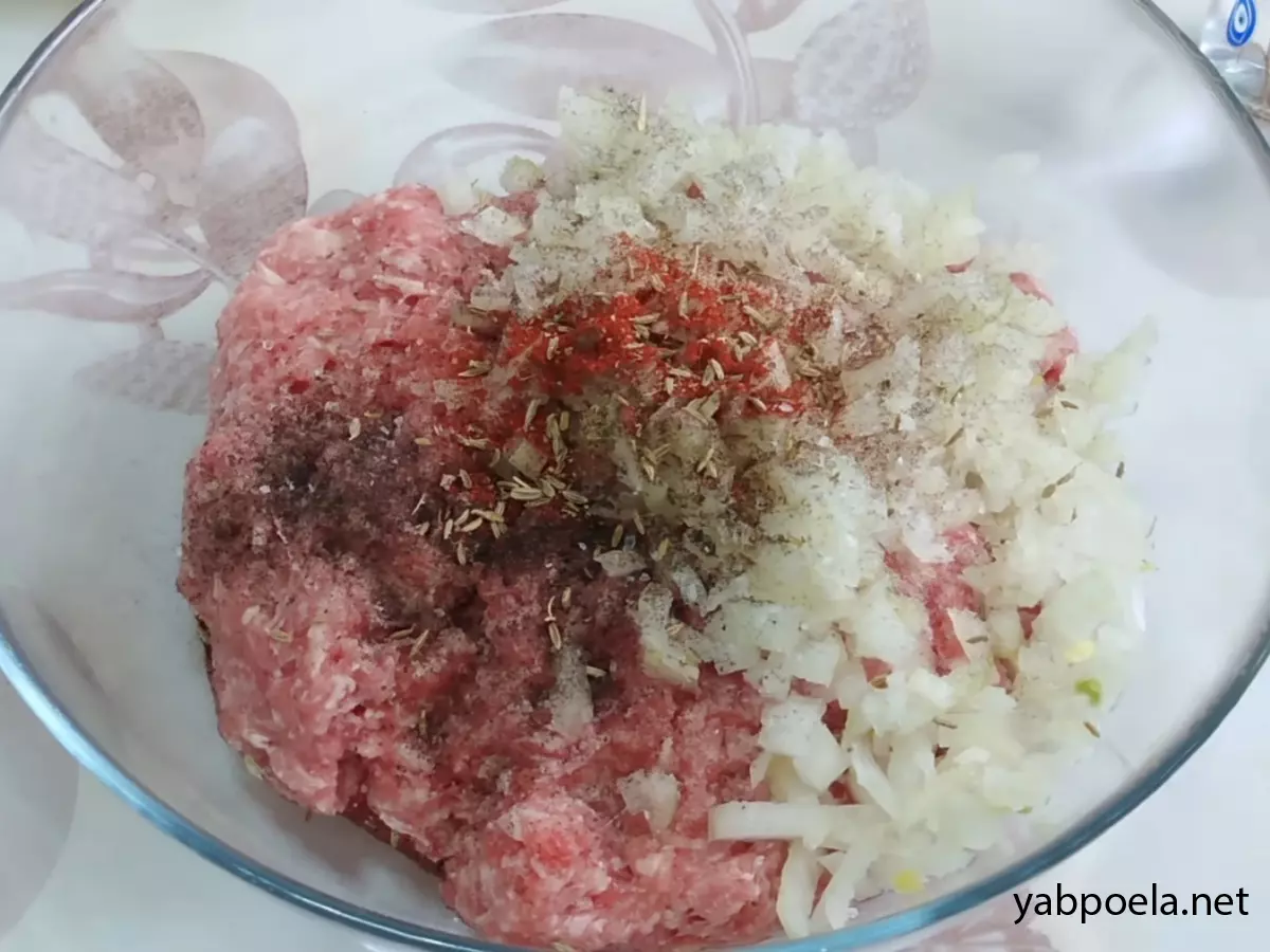 Мелко нарежьте луковицу и добавьте её к фаршу. Посолите, поперчите, добавьте паприку и зиру (обязательно разотрите семена в руках, чтобы раскрыть аромат). Если фарш густой, влейте немного воды и тщательно вымешайте до однородности.