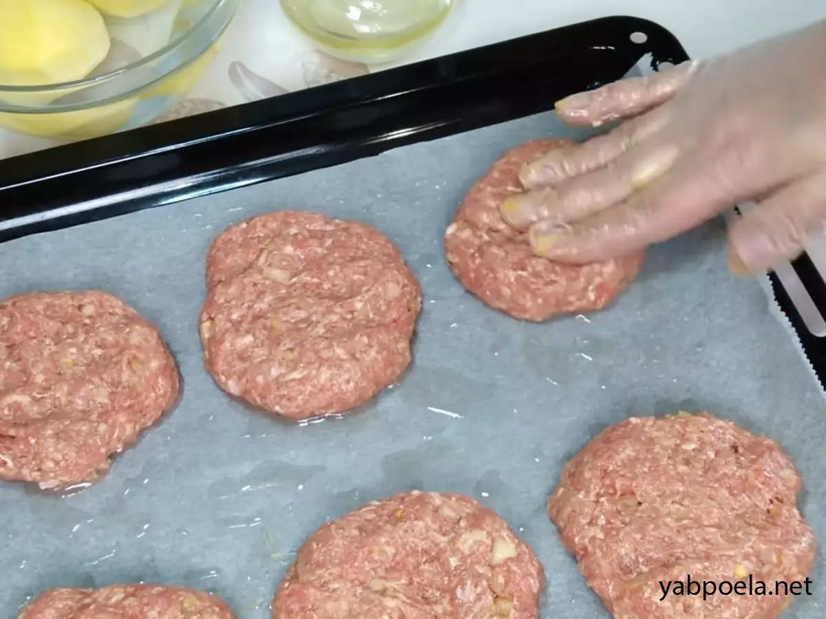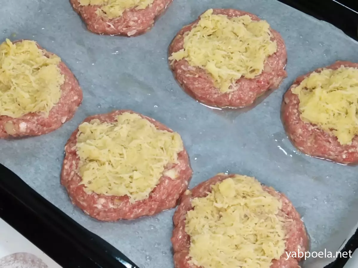 Противень застелите пергаментом и смажьте растительным маслом. Разделите фарш на 6 равных частей (примерно по 100–120 г). Сформируйте круглые котлеты и выложите их на противень, слегка приплюснув, чтобы получилась плоская «площадка» для начинки.