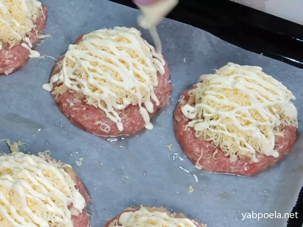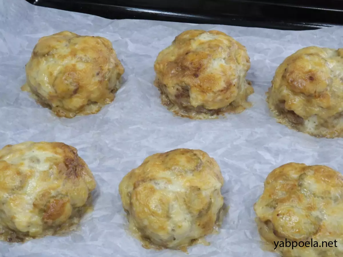 Обильно посыпьте каждое изделие тертым сыром, формируя высокую «шапочку». Сверху нанесите сеточку из майонеза (или просто небольшую порцию), чтобы сыр не подгорел и остался мягким.