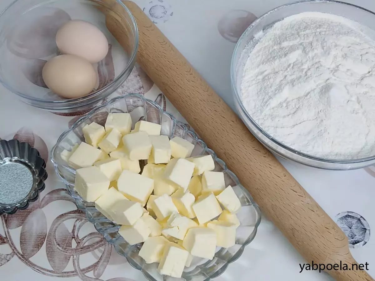 Подготовьте все необходимые ингредиенты и инструменты. Нам понадобится просеянная мука, мягкое сливочное масло, нарезанное кубиками, яйца, соль и сахар. Также подготовьте скалку и металлические формочки для тарталеток.