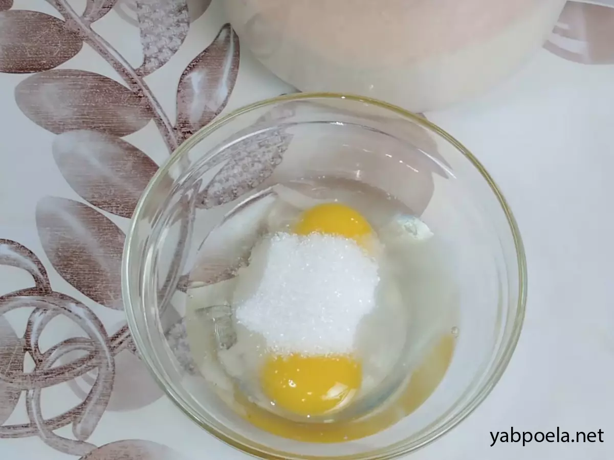 В отдельной емкости соедините 2 яйца, соль и сахар. Тщательно перемешайте (взбивать не нужно), чтобы кристаллы соли и сахара полностью растворились.