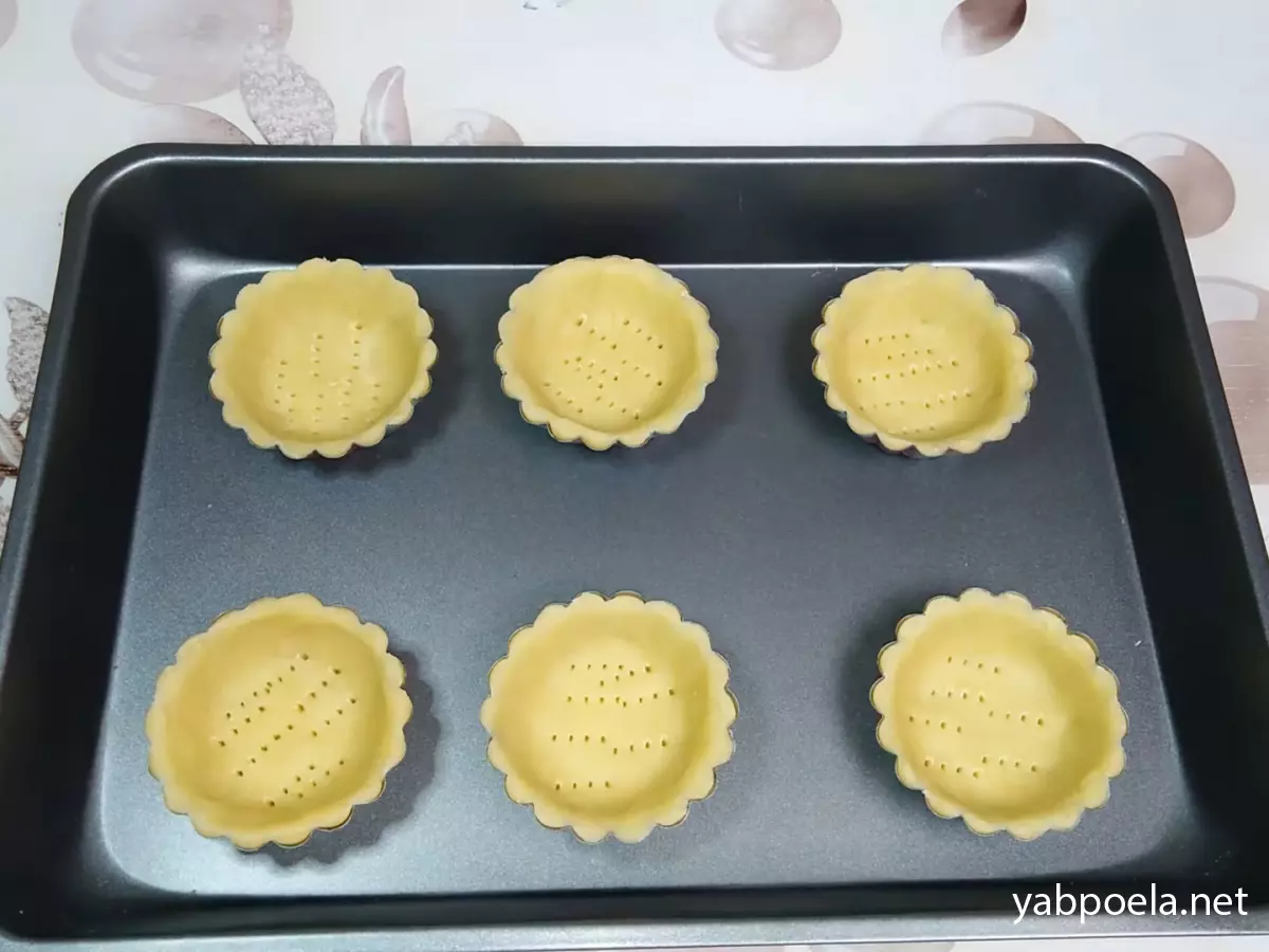 Обязательно густо наколите дно каждой тарталетки вилкой. Это нужно для того, чтобы тесто не вздувалось при выпечке.