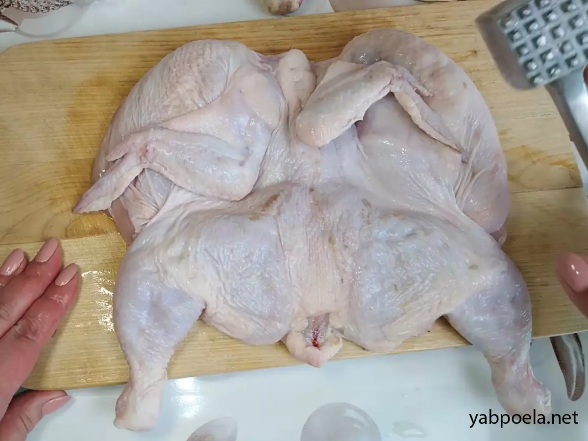 Чтобы цыпленок прожарился равномерно, его нужно сделать плоским. Слегка отбейте тушку молотком (без фанатизма, по 2–3 удара). Самое главное — перебить суставы у ножек и крыльев, чтобы они не топорщились, и тушка легла на сковороду ровно.