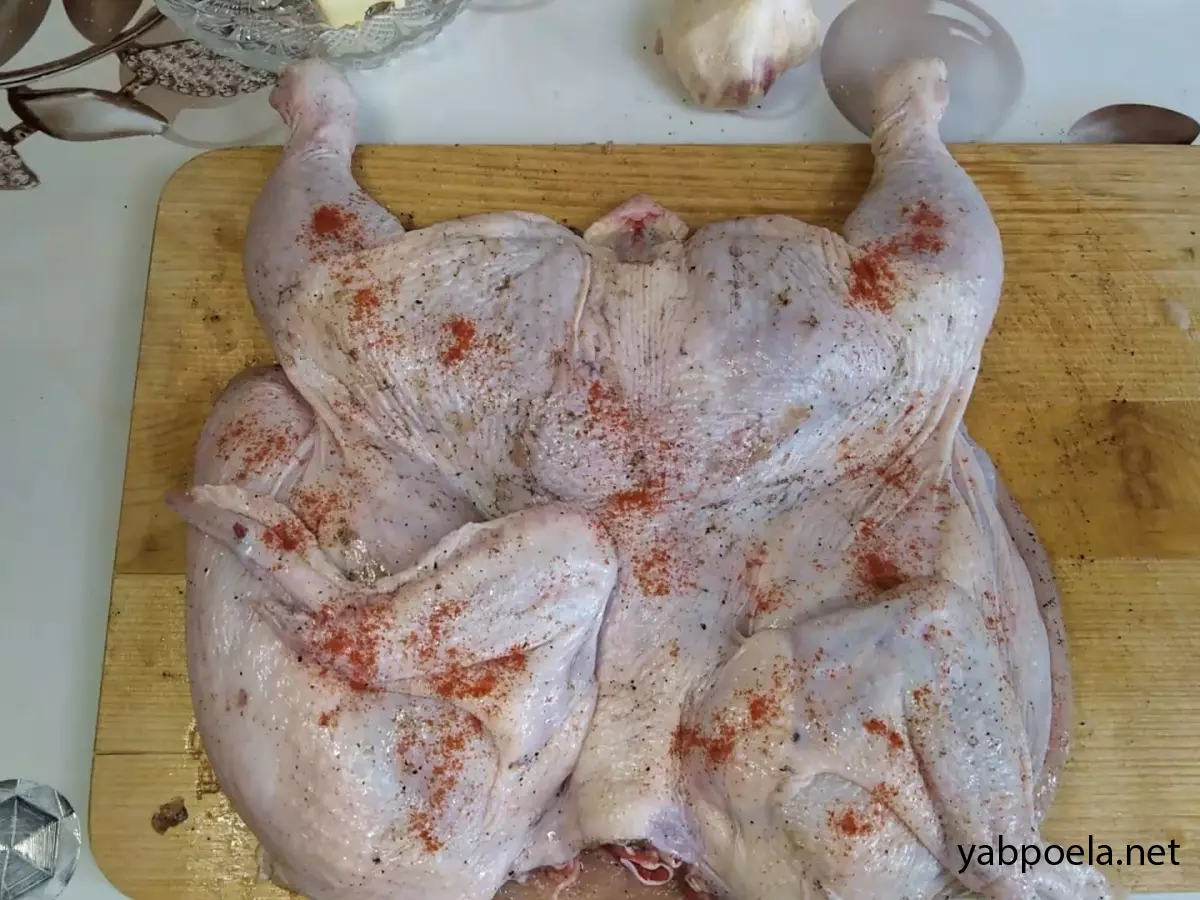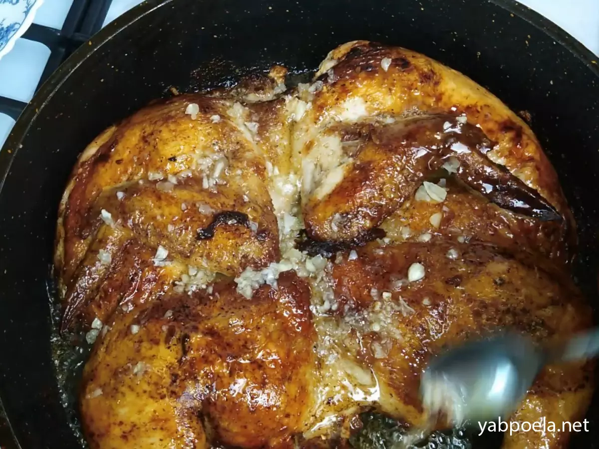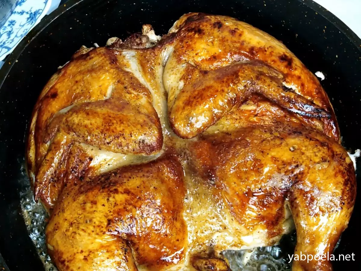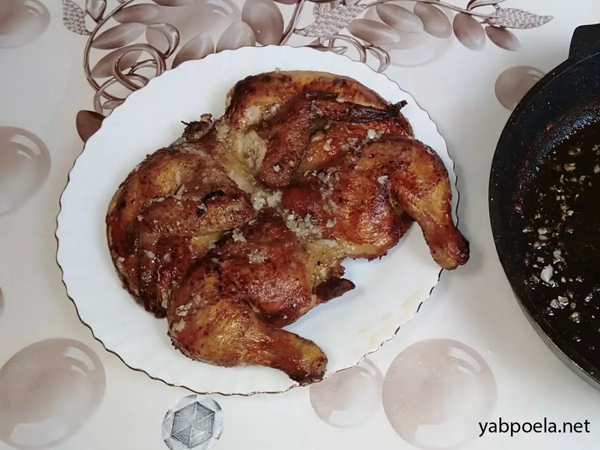 Чесночный финиш: Когда цыпленок полностью готов, быстро смажьте его измельченным чесноком сверху, полейте горячим маслом со сковороды. Переверните на пару секунд, чтобы чеснок отдал аромат, но не сгорел. Смажьте вторую сторону чесноком, снова переверните и сразу снимайте с огня.