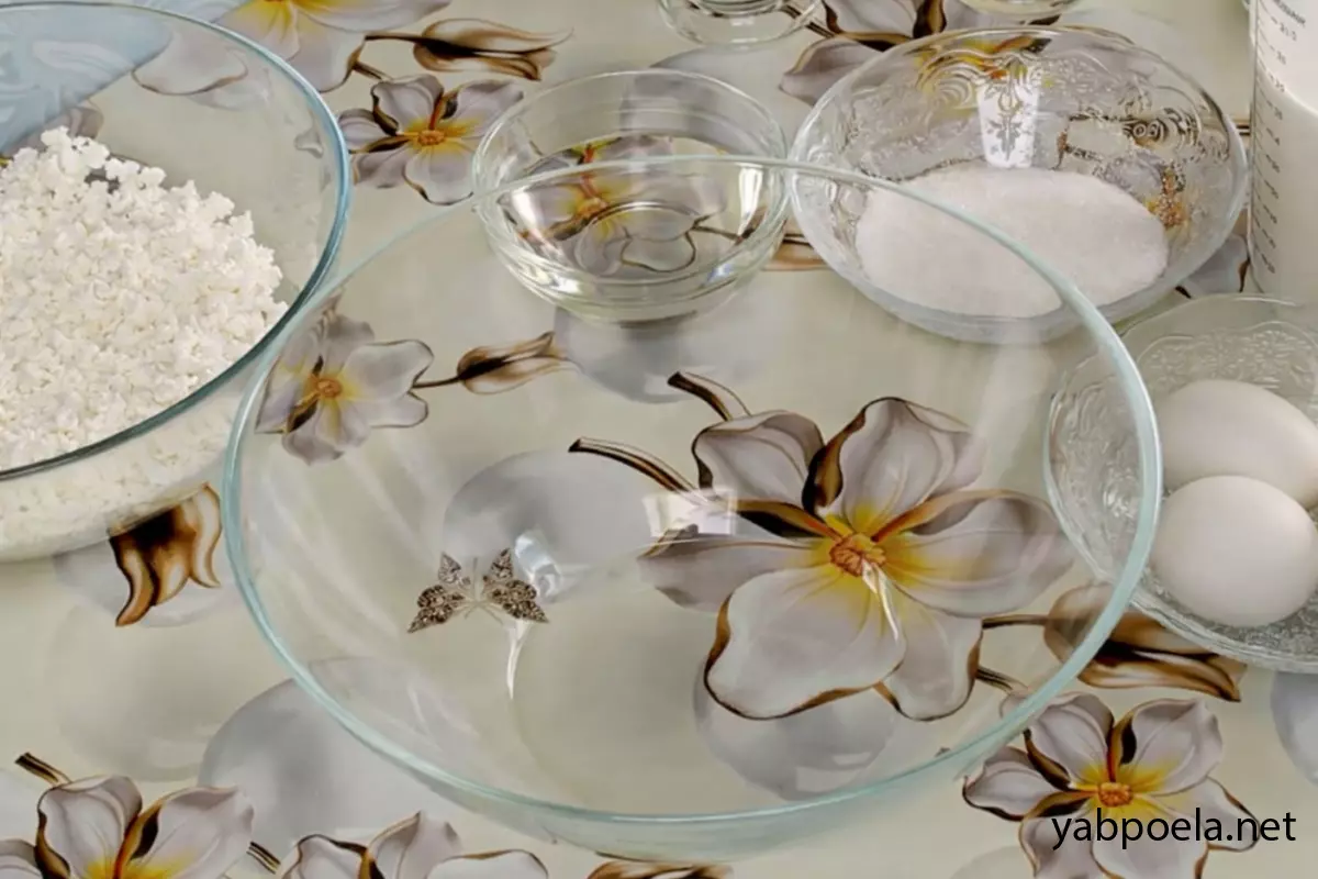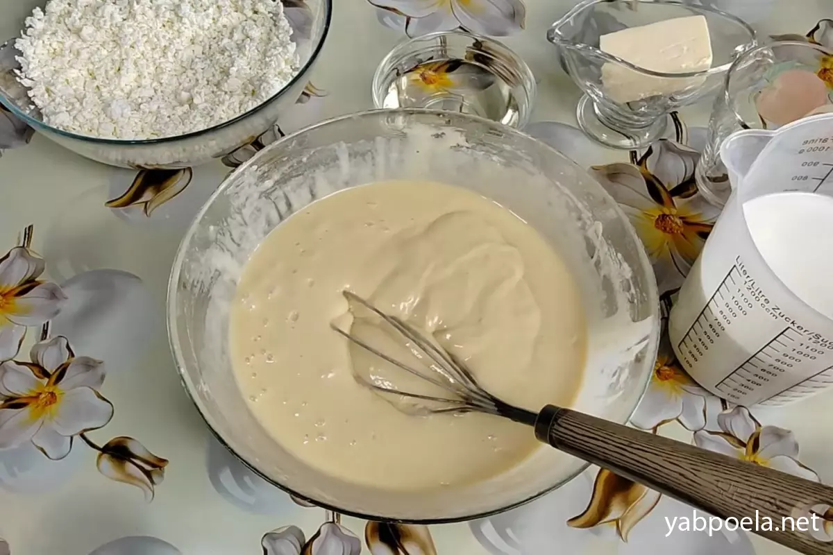 Подготовьте все ингредиенты. Нам понадобятся яйца, молоко, вода, мука, сахар, соль и растительное масло для теста. Для начинки возьмите творог и сахар, а для запекания — качественное сливочное масло. Также подготовьте миксер или венчик, сковороду и форму для запекания.