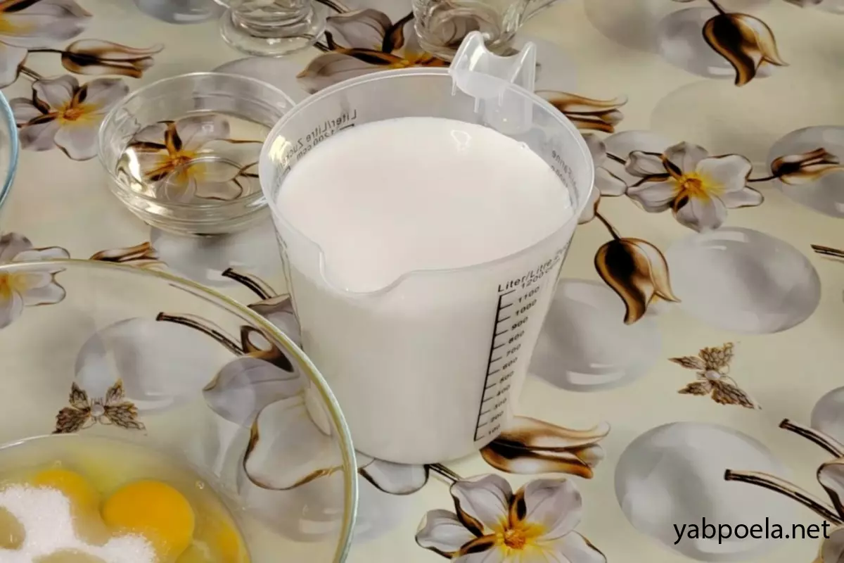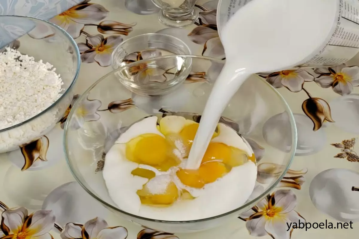 В отдельную емкость разбейте 5 яиц, добавьте 1.5 ч. л. соли и 5 ст. л. сахара. Влейте примерно половину жидкостной смеси (молоко с водой). Тщательно перемешайте, чтобы соль и сахар растворились.