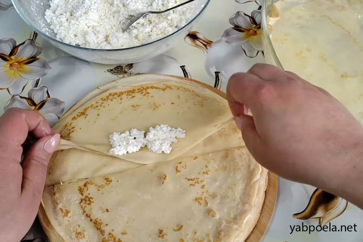 Каждый готовый блин разрежьте ножом пополам. На край половинки положите 1 ч. л. творожной начинки и сверните в тонкую трубочку (как пальчик).