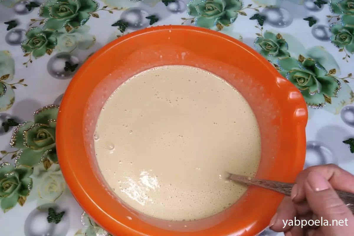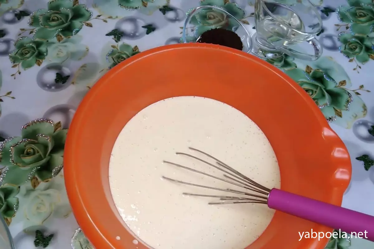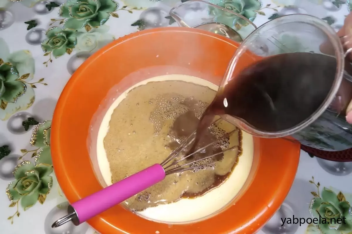 Добавьте в густое тесто 1 ч. л. соды. Сразу же влейте сверху горячий кофе. Сода вступит в реакцию с кипятком и погасится. Быстро и тщательно перемешайте тесто до однородности. Оно станет жидким и ароматным.