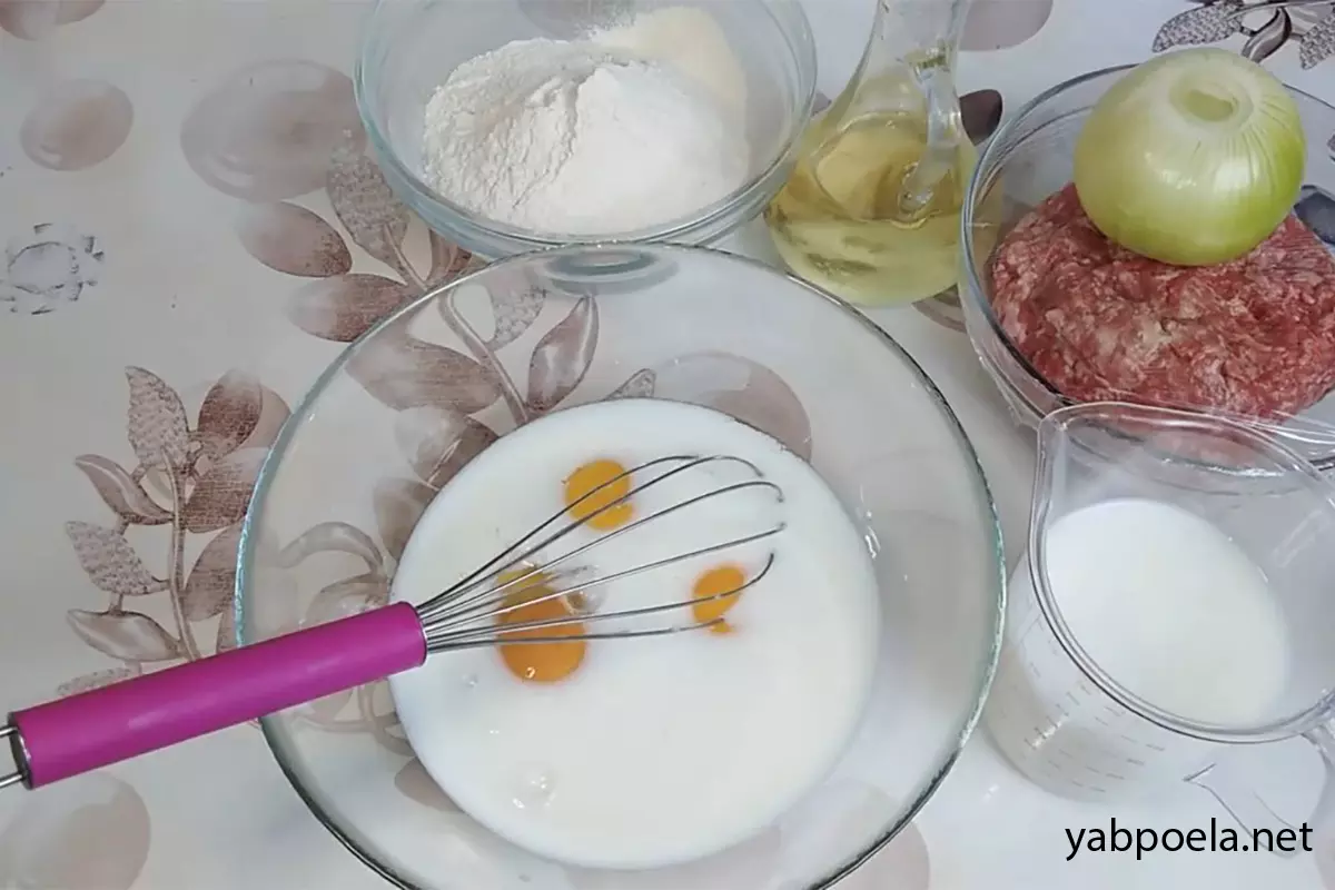В глубокую миску разбейте 3 яйца, добавьте 4 ч. л. сахара и 1 ч. л. соли (неполную, без горки). Влейте примерно половину жидкости (смесь молока и воды). Перемешайте.