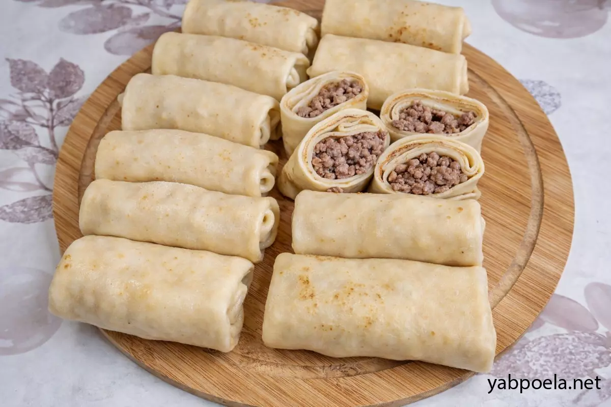 Тесто на смеси молока и воды получается легким и не рвется при сворачивании. А секрет сочности фарша кроется в добавлении небольшого количества воды при жарке — начинка не будет сухой, даже если использовать нежирное мясо.