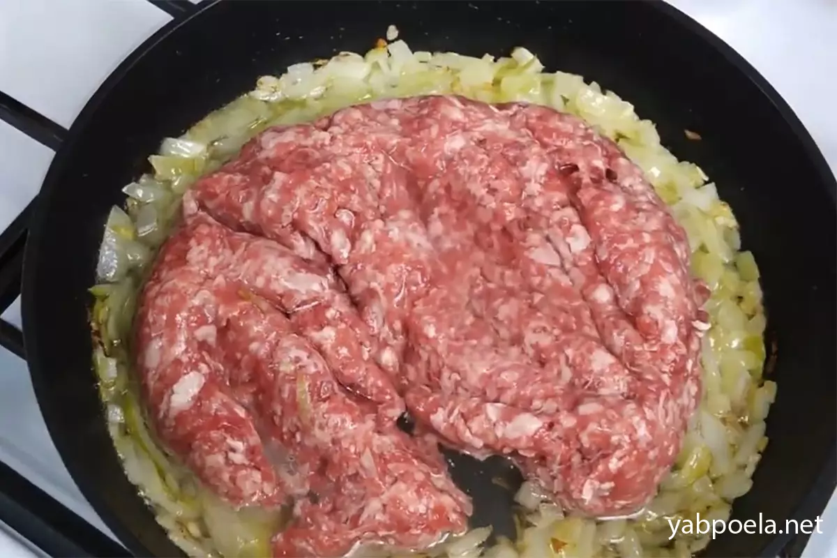 К луку добавьте мясной фарш. Сразу же влейте полстакана воды. Перемешайте.