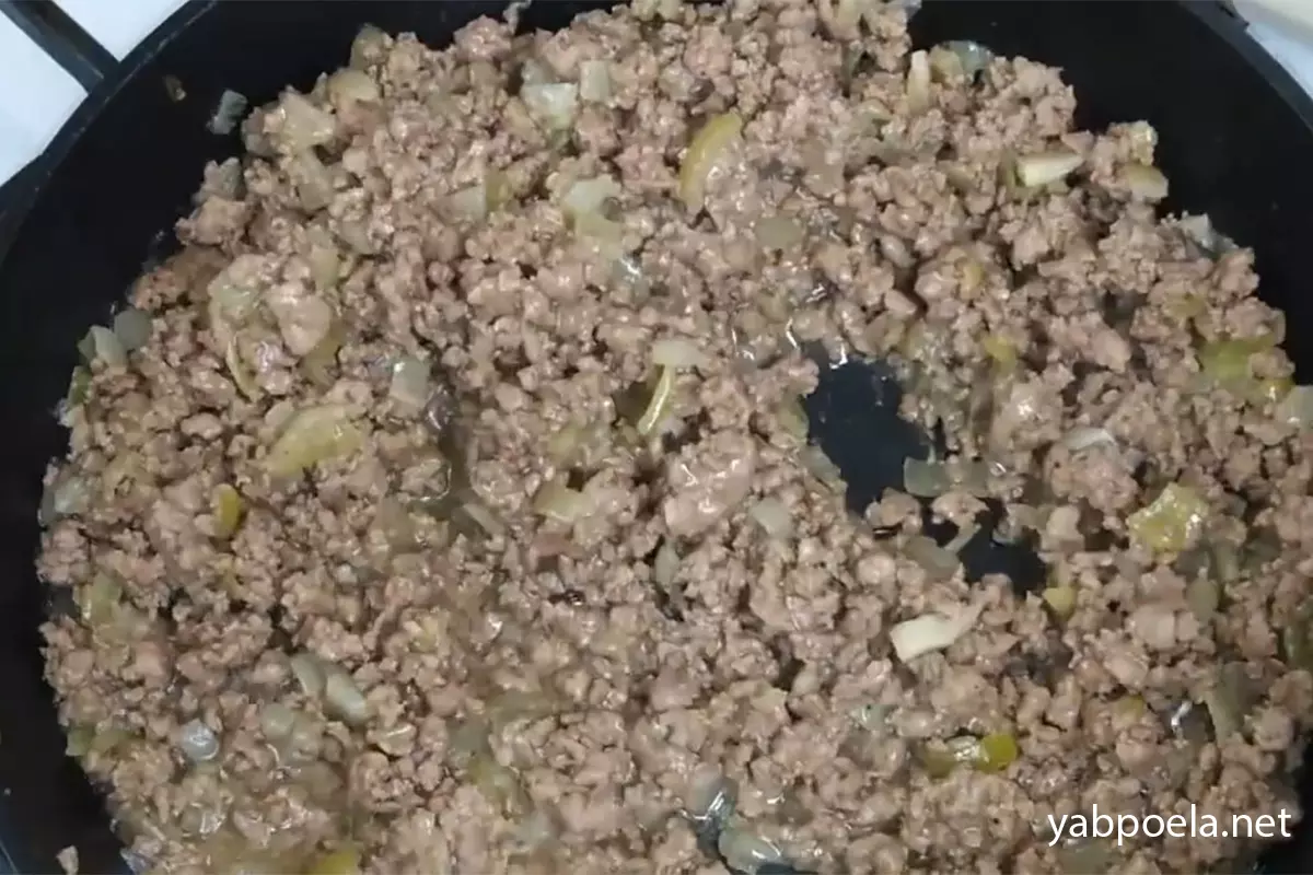 Тушите фарш, пока вся жидкость не выпарится. В конце добавьте соль и черный молотый перец по вкусу. Начинка готова.