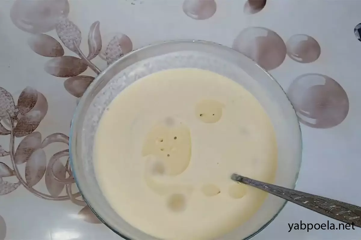 Всыпьте муку (200–220 г). Тщательно вымешайте тесто венчиком, чтобы разбить все комочки и получить густую, гладкую массу.