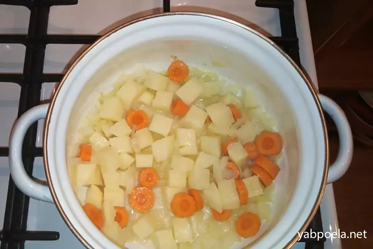 Добавляем к луку морковь и картофель. Перемешиваем, накрываем крышкой и даем овощам потомиться на среднем огне около 5-7 минут. Не забывайте помешивать, чтобы не пригорело.