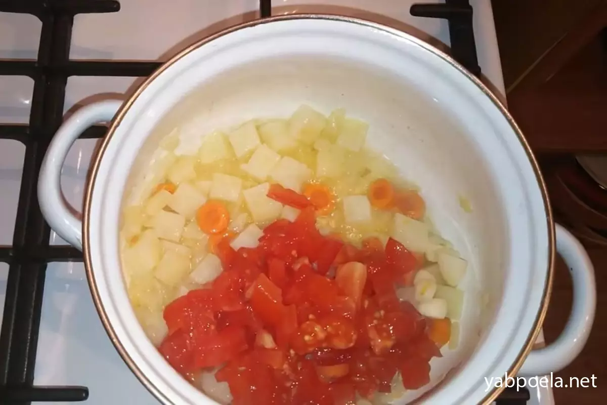 Чеснок нарезаем крупно. Добавляем в кастрюлю чеснок и нарезанный помидор. Перемешиваем, снова накрываем крышкой и тушим еще 5-7 минут, чтобы помидор дал сок и смягчился.