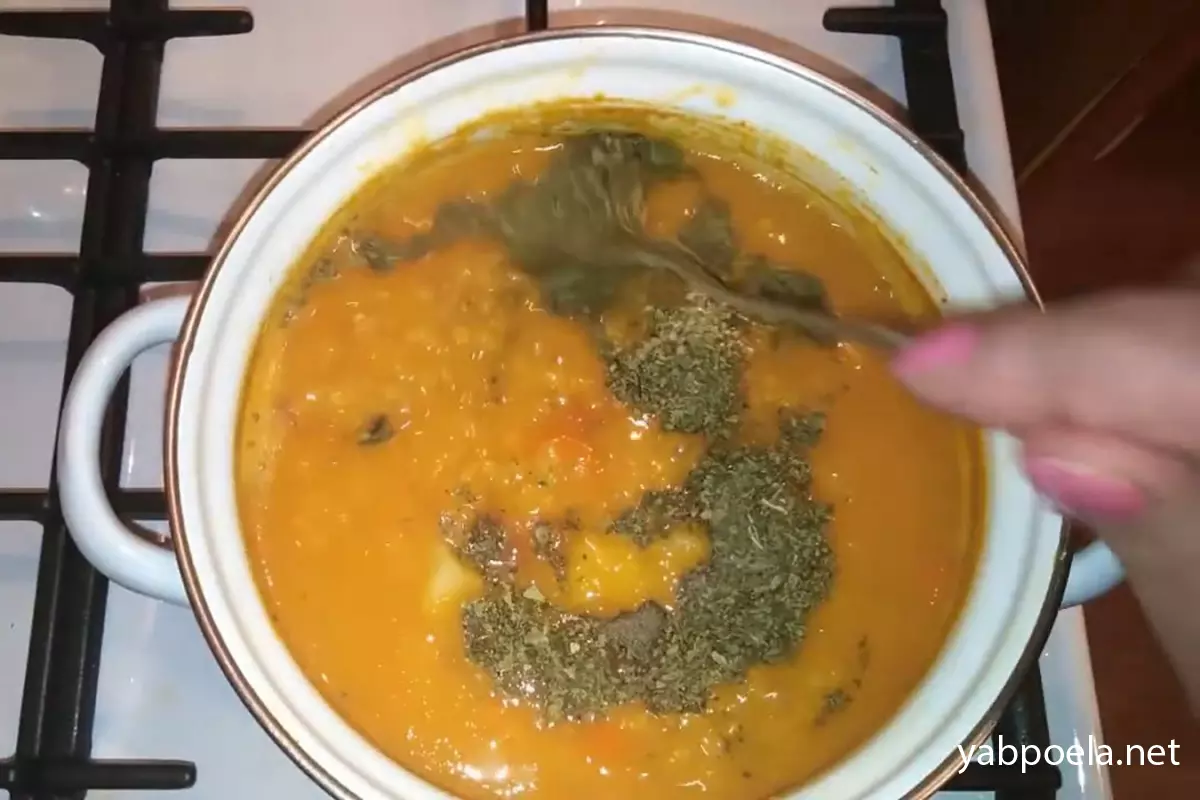 Когда чечевица готова, добавляем соль, черный перец, тимьян и обязательно сушеную мяту — она главный секрет вкуса этого супа. Даем покипеть со специями 2 минуты и снимаем с огня.